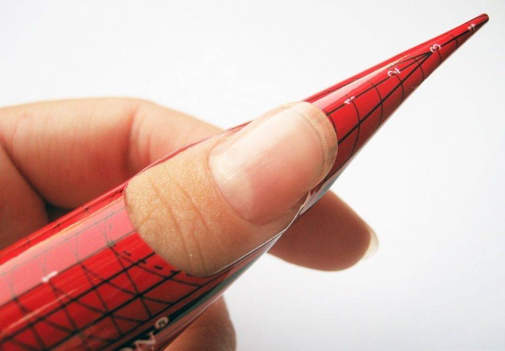 - Затем убрать шаблон и, воспользовавшись пилкой, обработать ноготь, придав нужную форму и устранив недостатки.