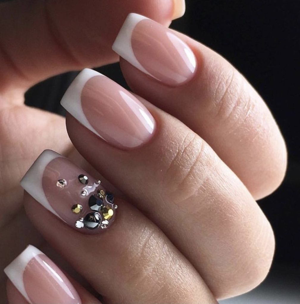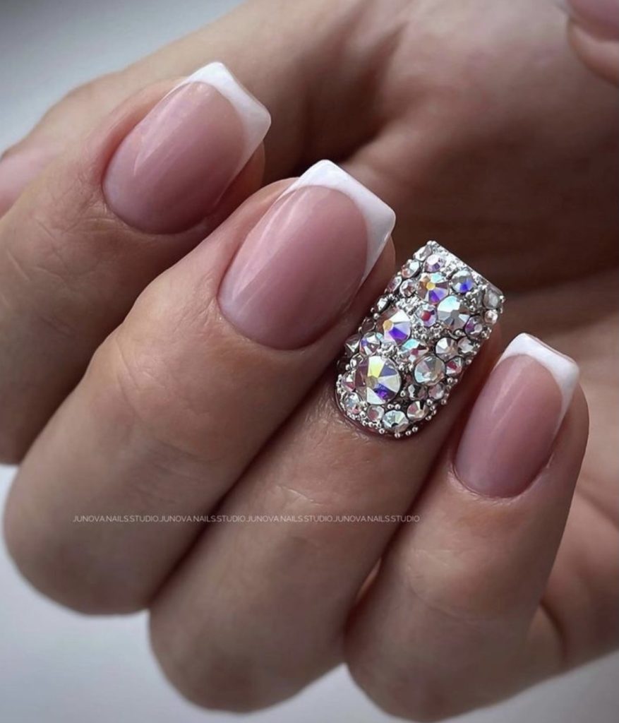 Стразы прекрасно подойдут к круговому, графичному френчу с дополнением на 2 пальцах. Все зависит от дизайна, но можно использовать, как повседневный вариант.