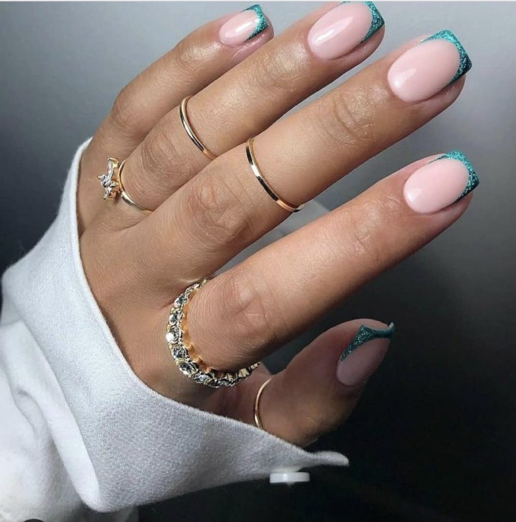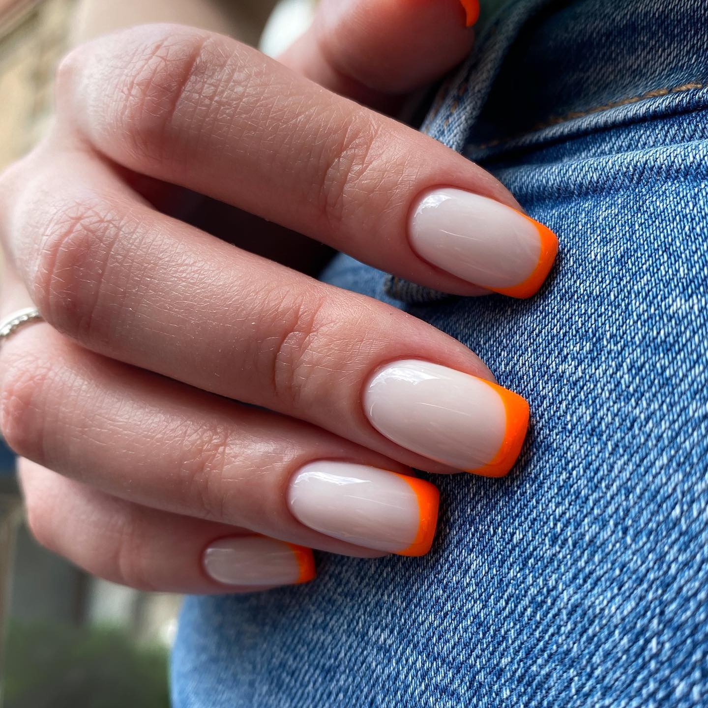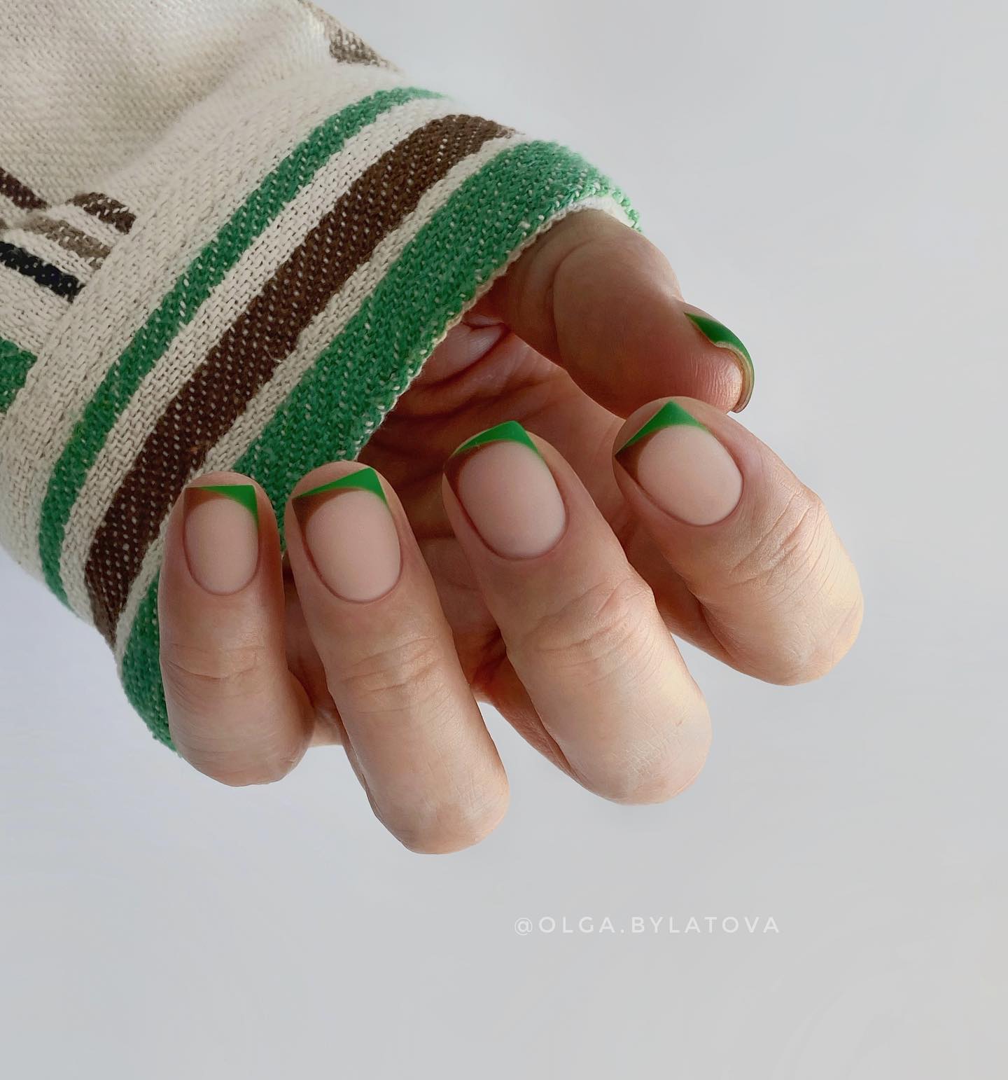 Еще один популярный вариант френча на ногтях, который все чаще мелькает в соц. сетях. Его сделать очень легко – достаточно окрасить край ногтя лаком любимого цвета. Лучше всего это делать с помощью трафаретов для французского маникюра. Самые модные оттенки: зеленый, желтый, оранжевый, ярко-розовый, голубой и сиреневый.