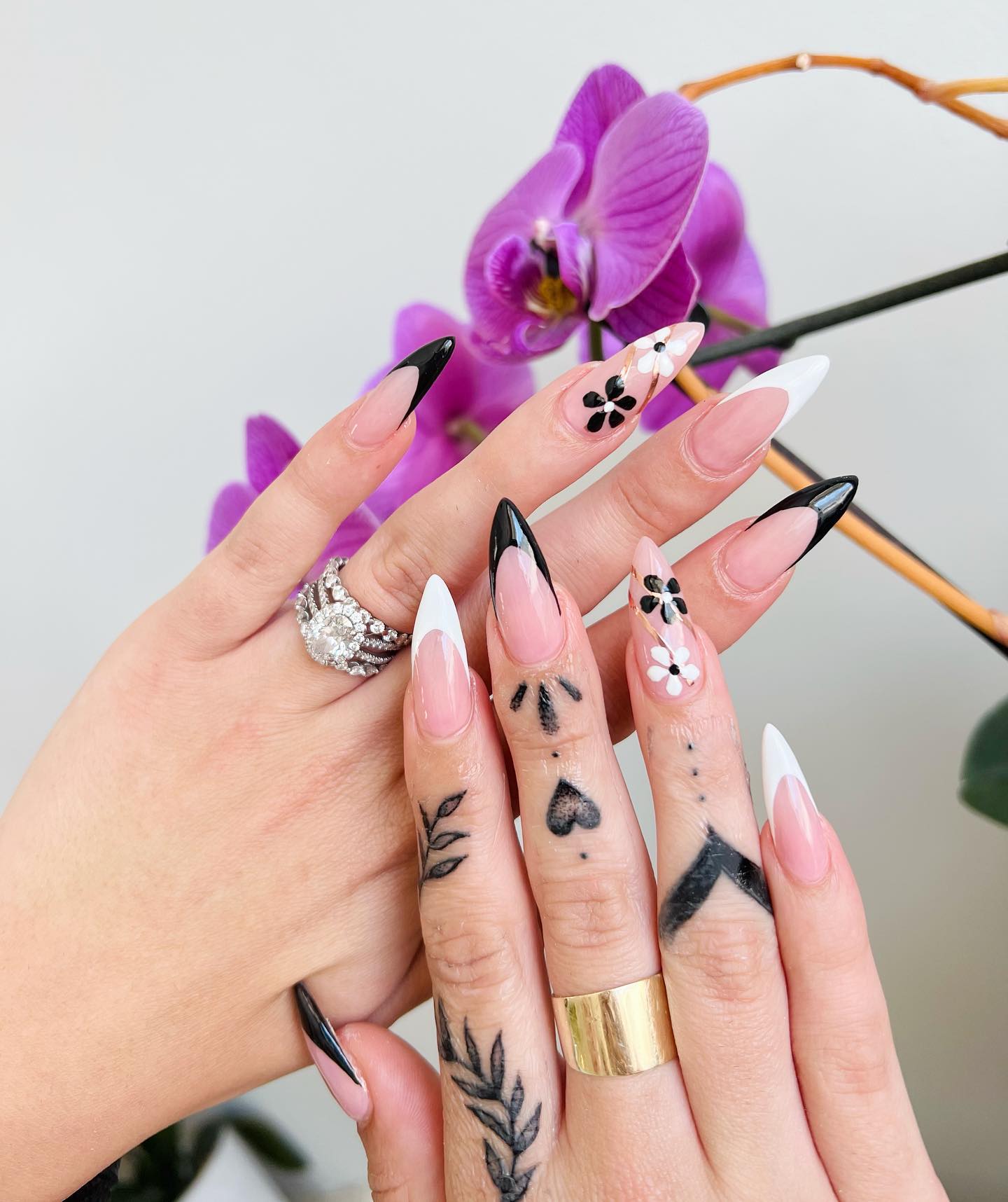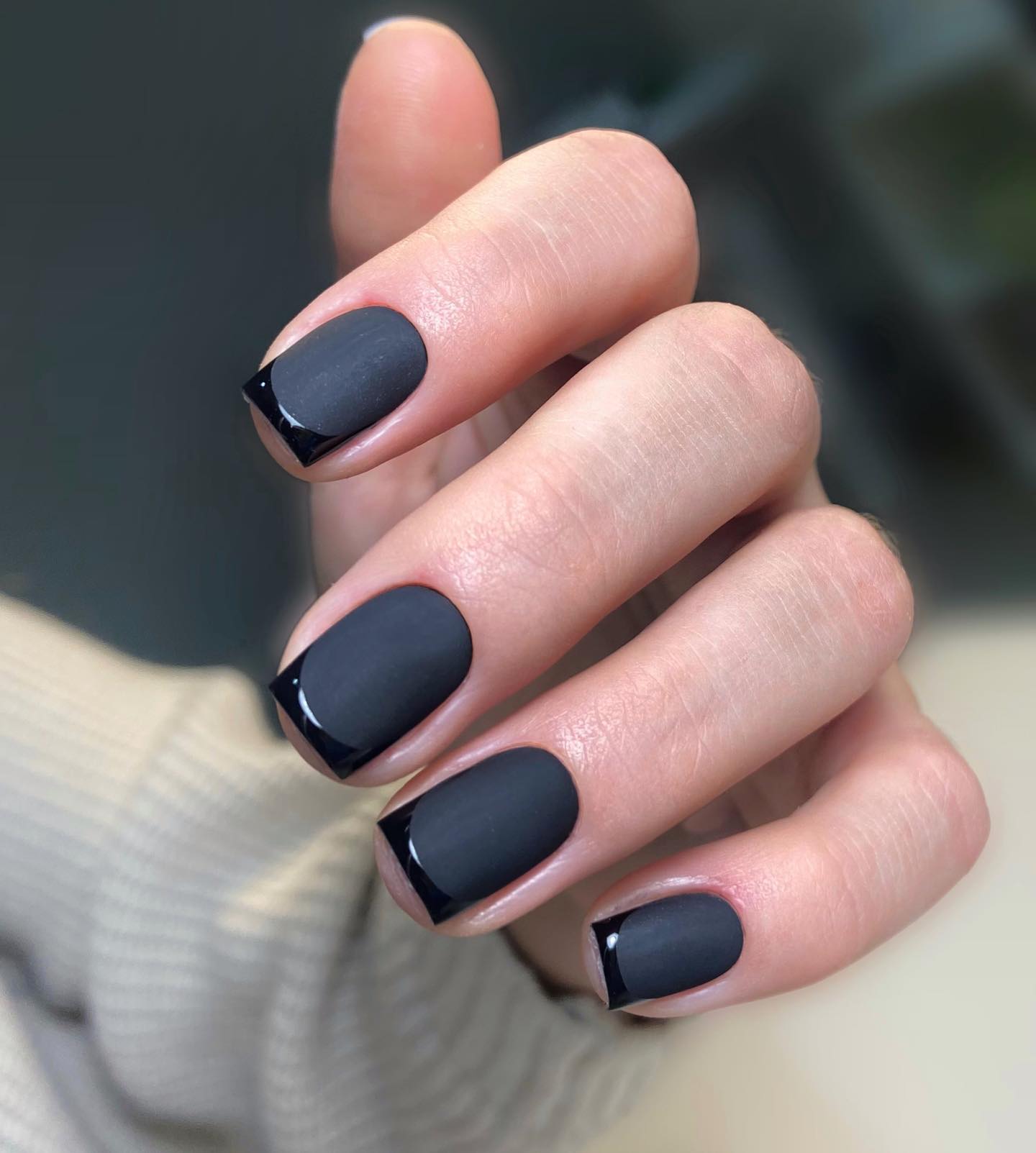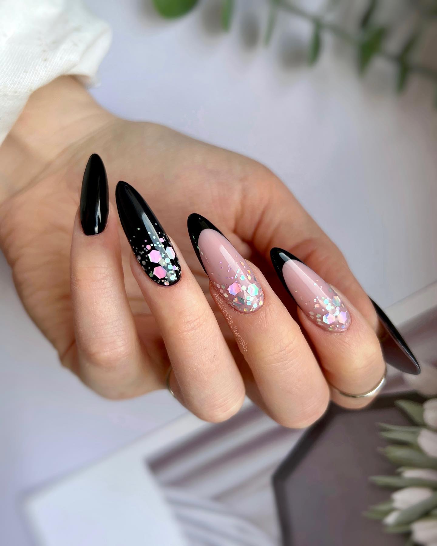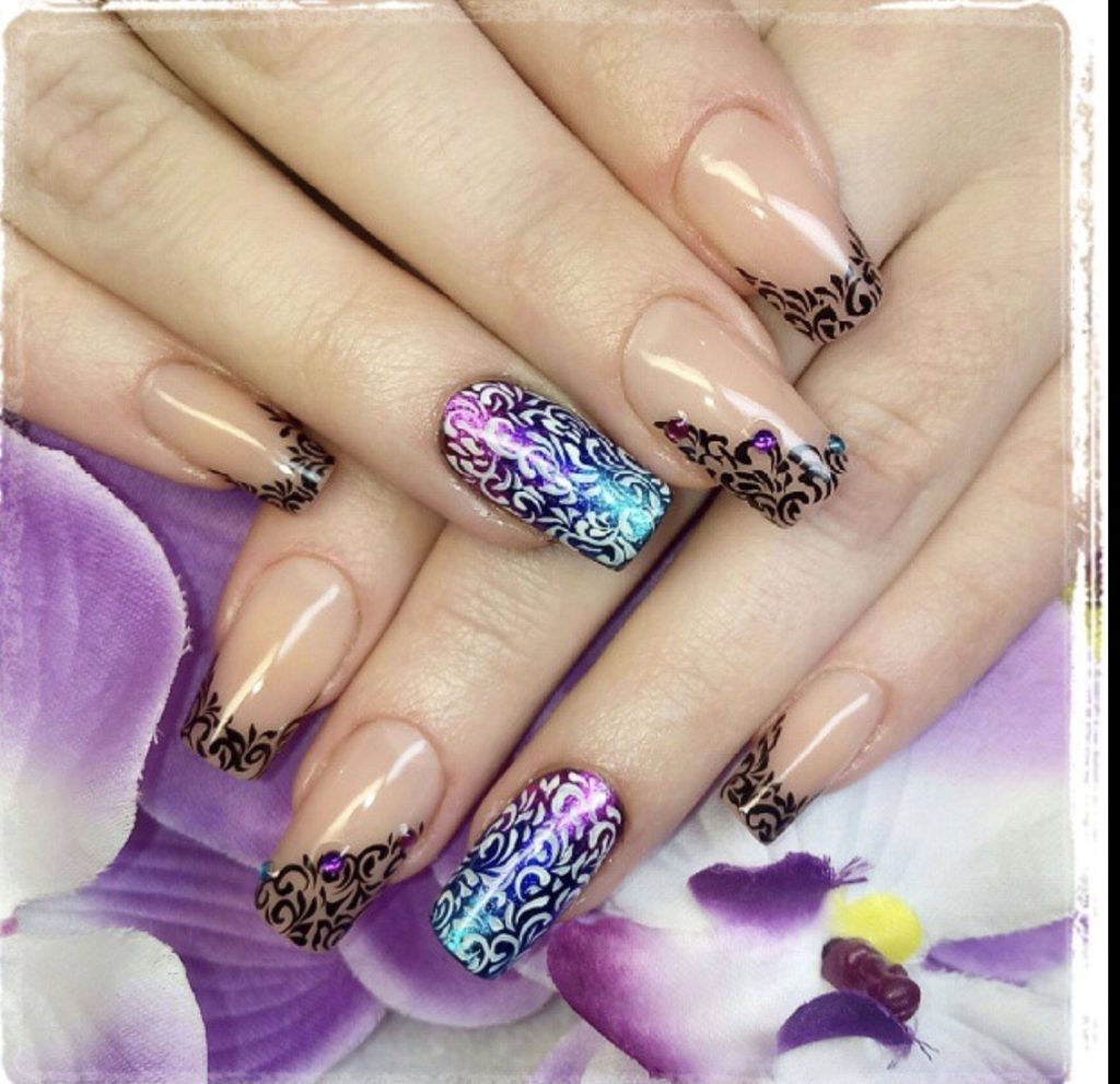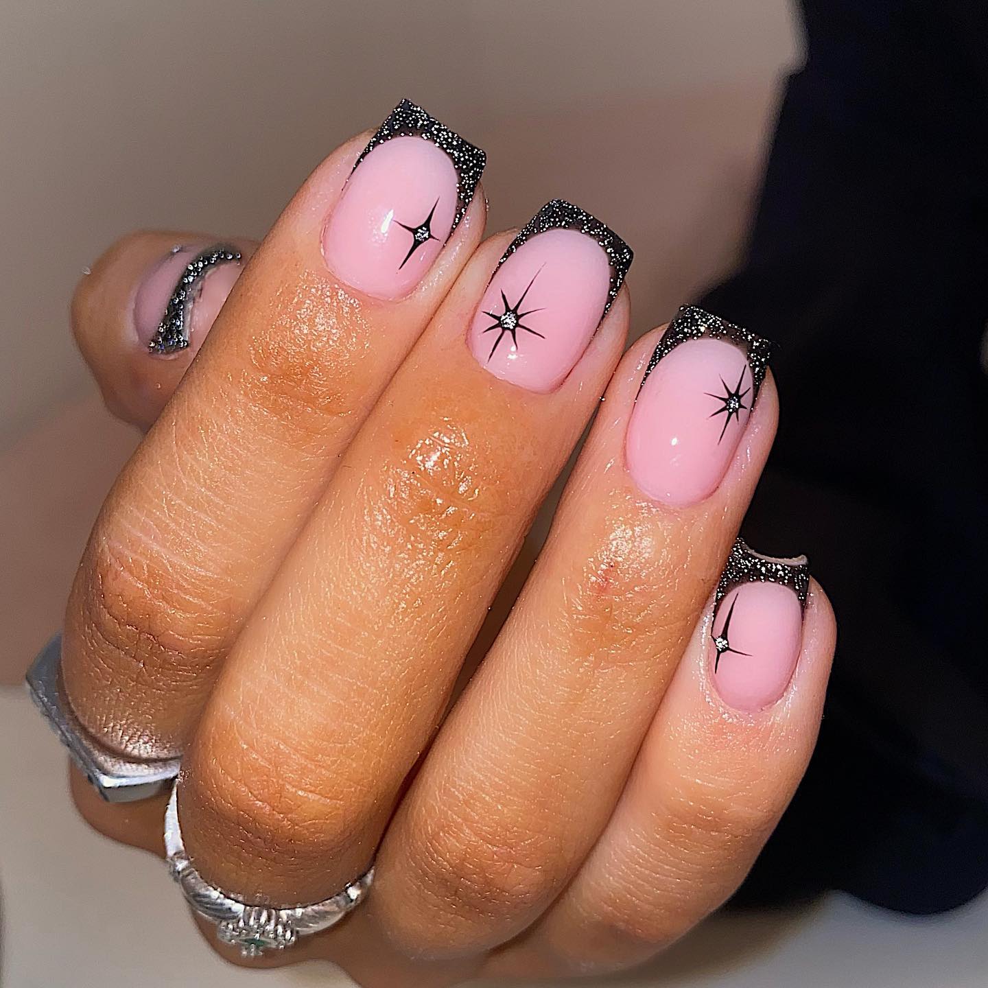 Французский черный включает в себя все те же бесцветные лаки для ногтей, только на этот раз вместо страз узоры нарисованы черным цветом. Узоры могут быть как геометрическими, так и более сложными. Каждый мотив может быть представлен черным цветом, при необходимости можно добавить другой цвет.