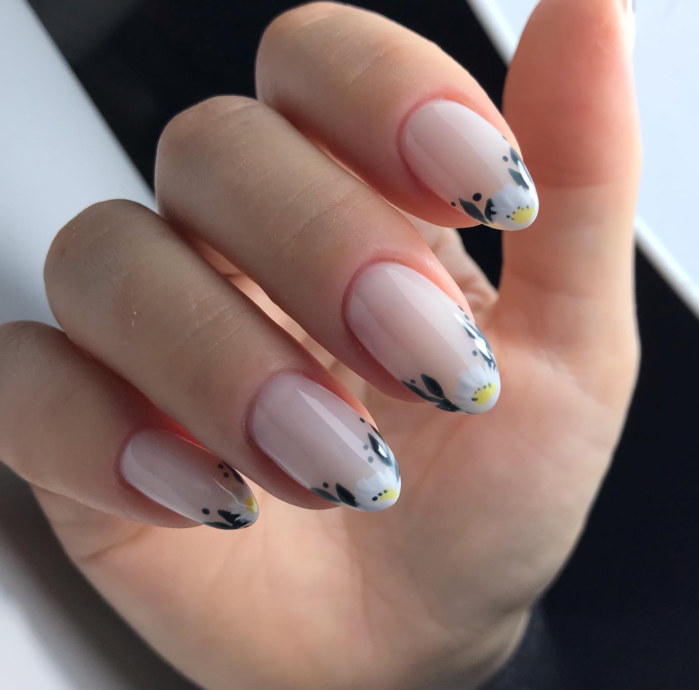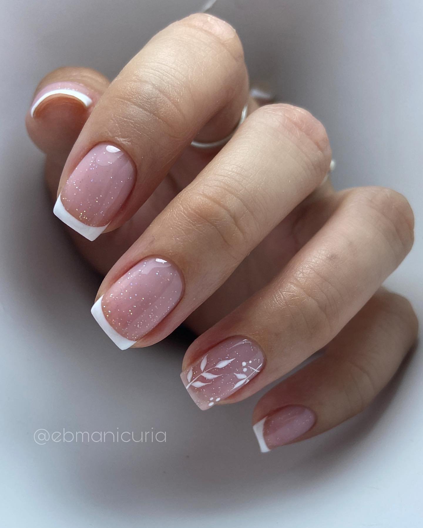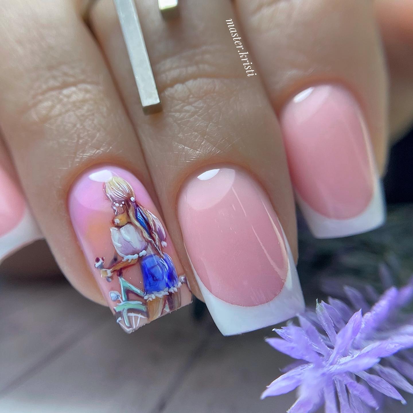 В топе модных тенденций французский маникюр с рисунком. Здесь несколько ногтей дополнительно украшаются рисунком. Выбор принта зависит от вашей фантазии, но все еще популярны растительные, абстрактные и цветочные мотивы.