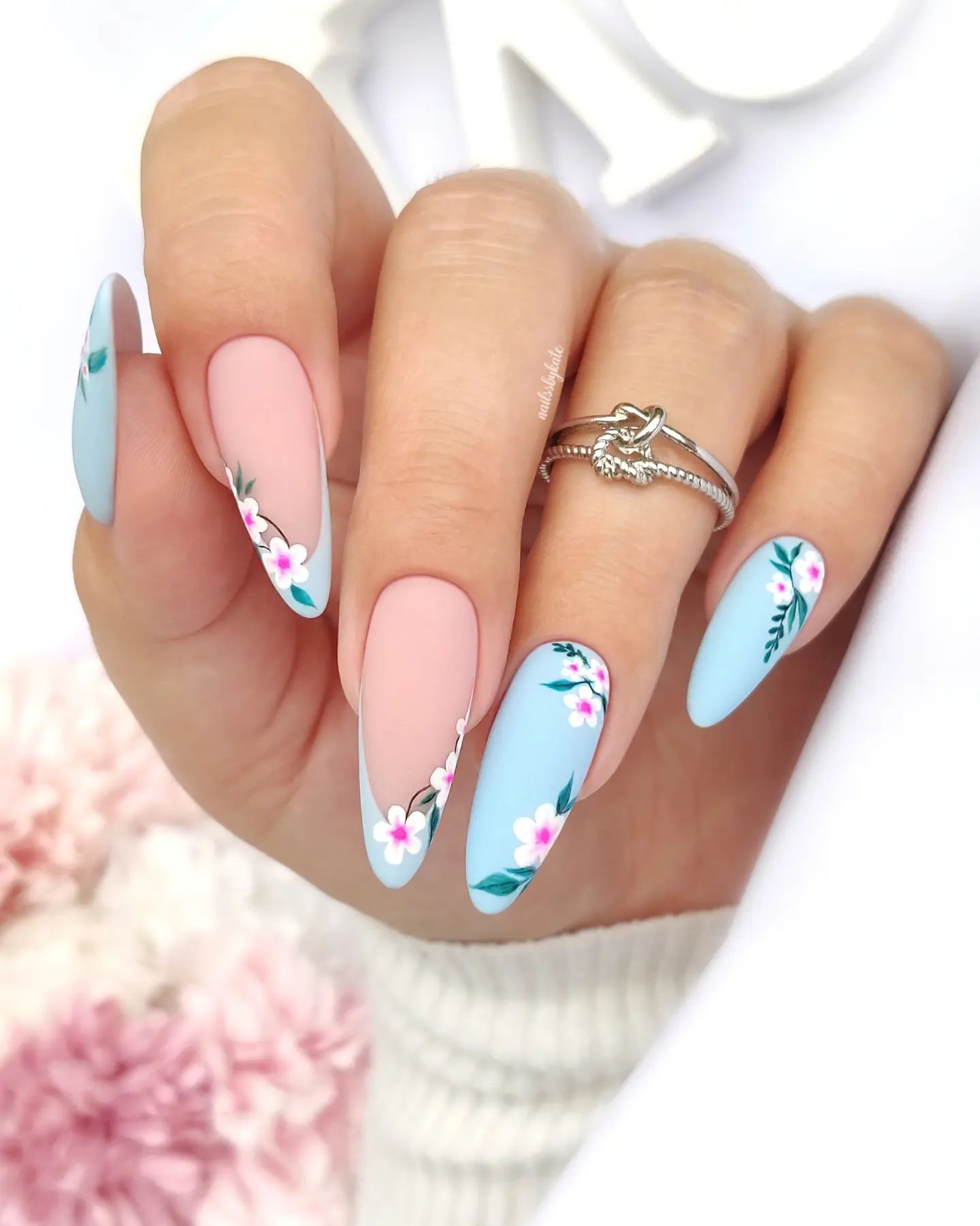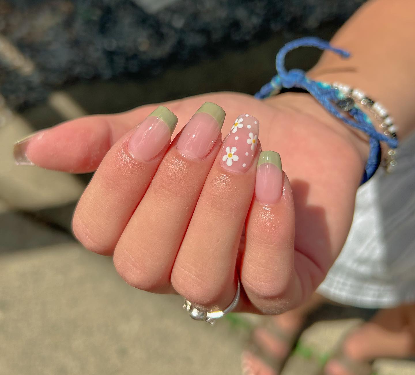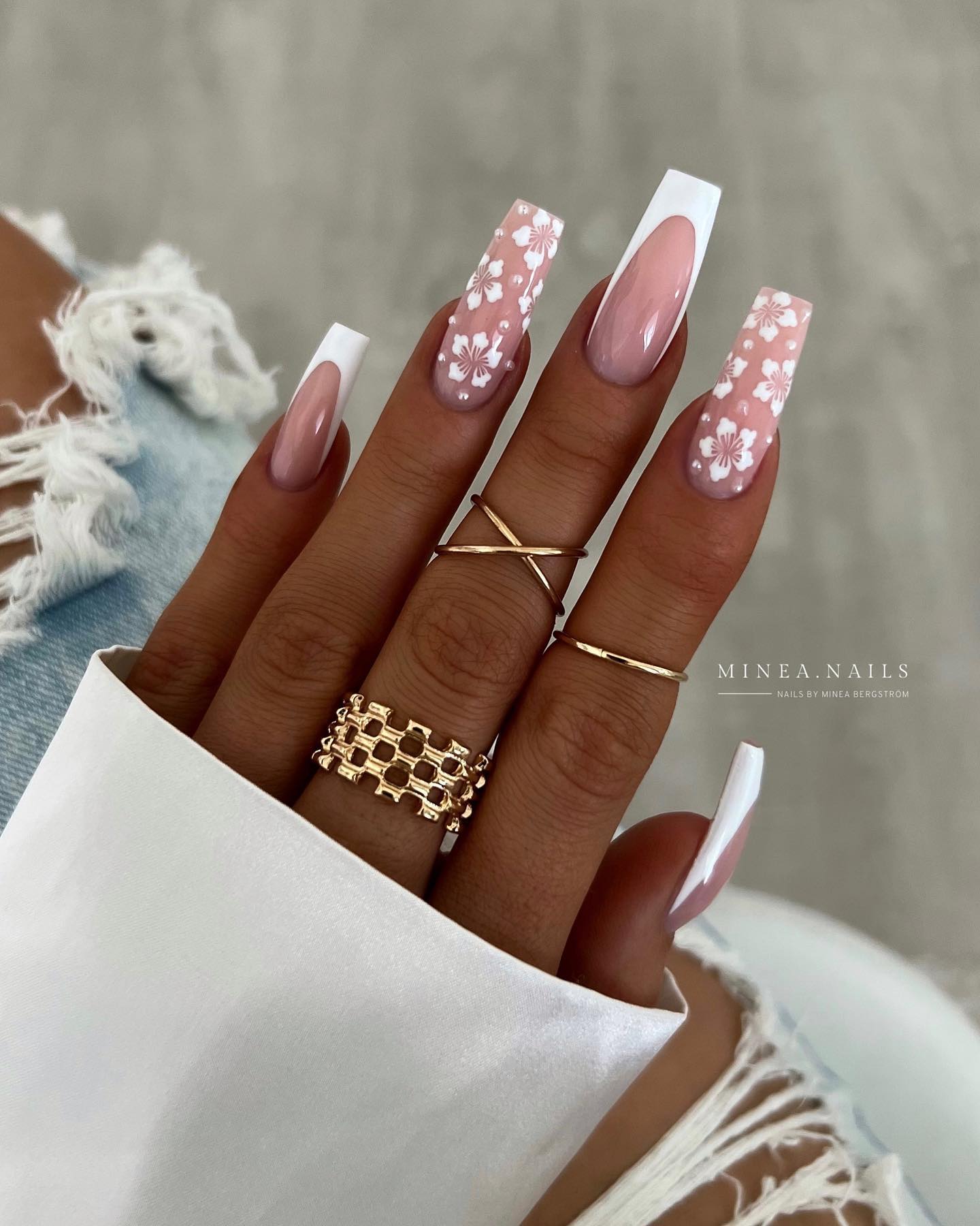 В топе модных тенденций французский маникюр с рисунком. Здесь несколько ногтей дополнительно украшаются рисунком. Выбор принта зависит от вашей фантазии, но все еще популярны растительные, абстрактные и цветочные мотивы.