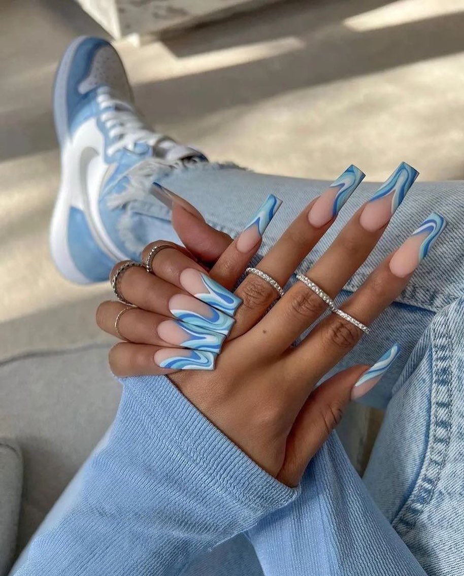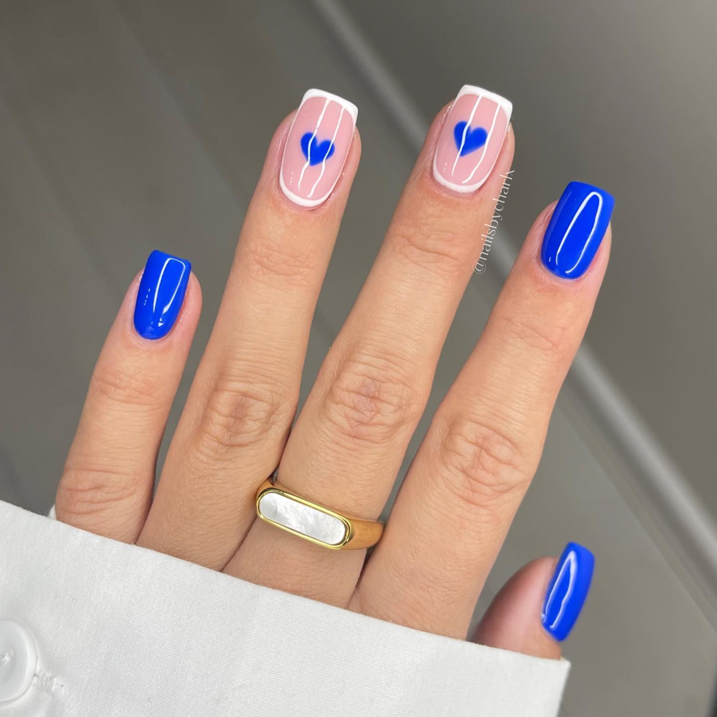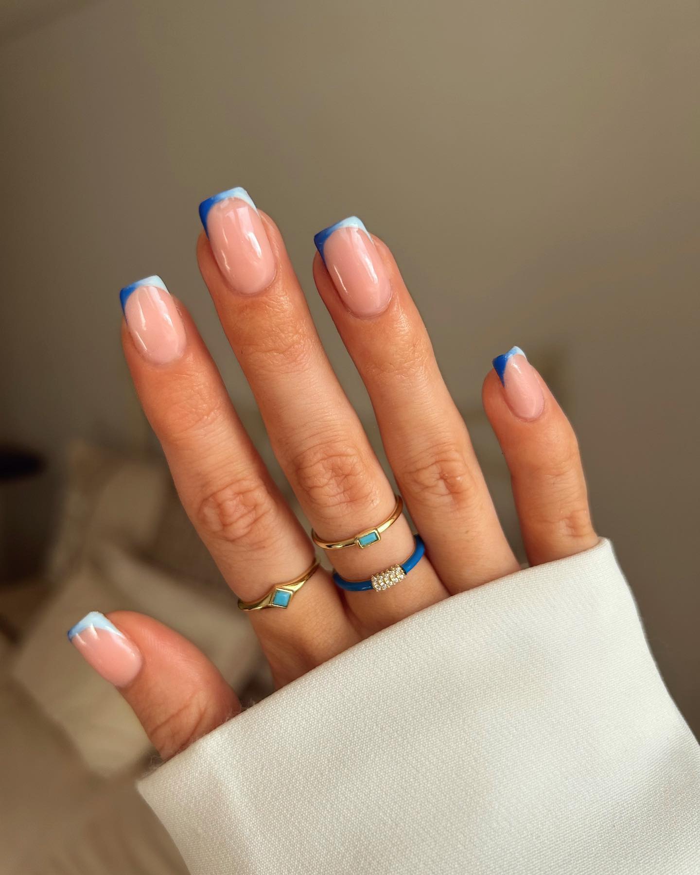 Синий френч отлично смотрится как на коротких, так и на длинных ногтях. Актуальный в 2020 году синий цвет шикарно сочетается с камнями и блестками – смотрите идеи на фото ниже:
