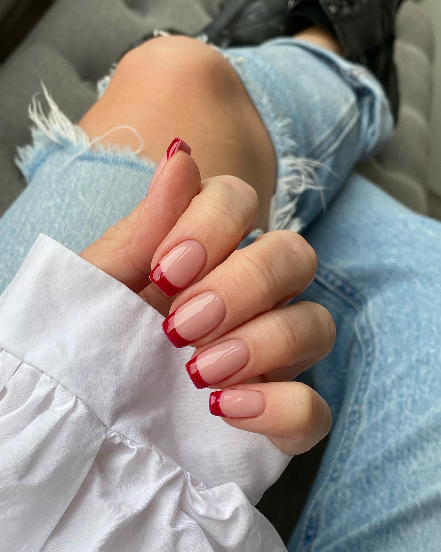 Ультрамодный маникюр френч 2022 года представляет собой почти классический дизайн. Вот только выступающий край ногтя окрашен не в белый, а в красный цвет. Такой вариант выглядит очень естественно и при этом ярко и неординарно, ведь сочетает в себе сразу два классических приема – френч и красный лак.
