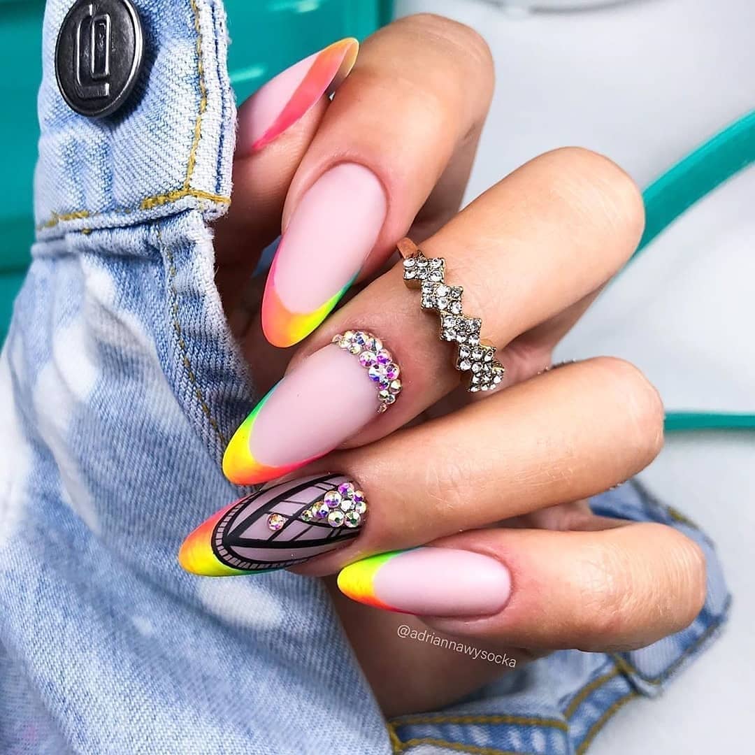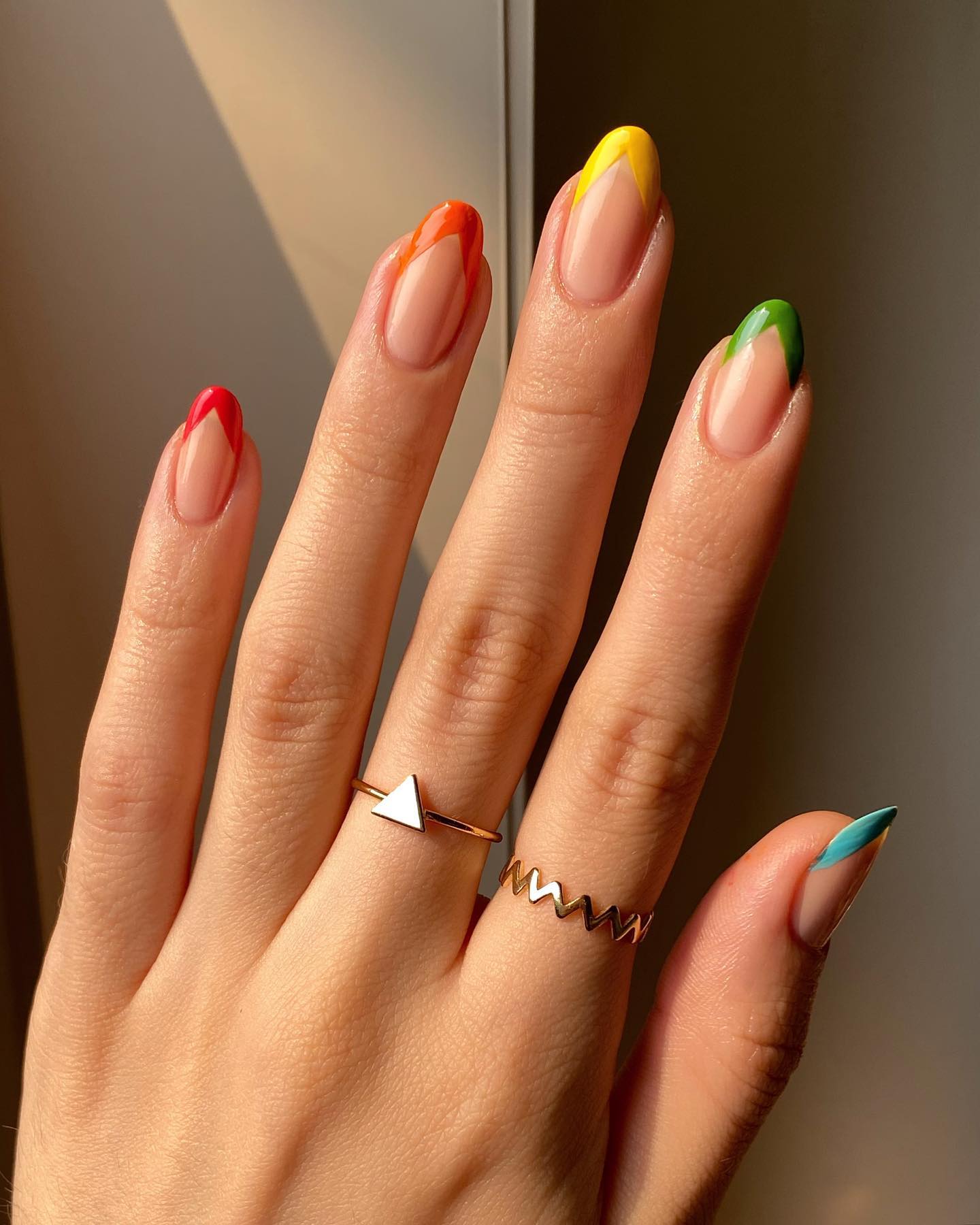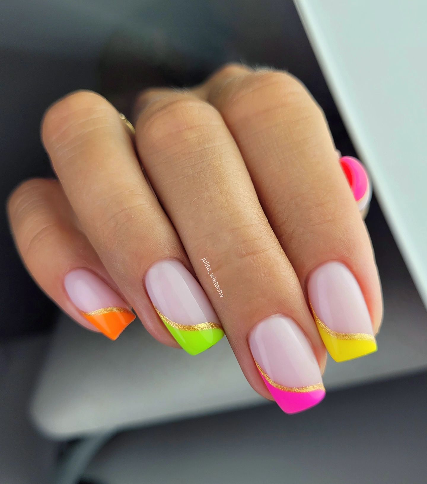 Вариант цветного френча, при котором каждый ноготь окрашивается в отдельный яркий цвет. Самый классный нейл-дизайн для лета уже оценили многие модницы в соц. сетях, так как он отлично сочетается с яркими летними коктейлями, купальниками и общей атмосферой релакса.