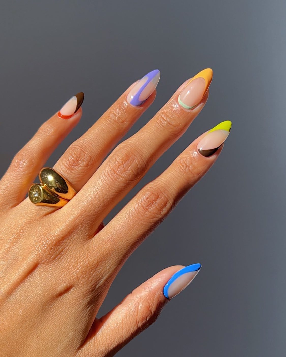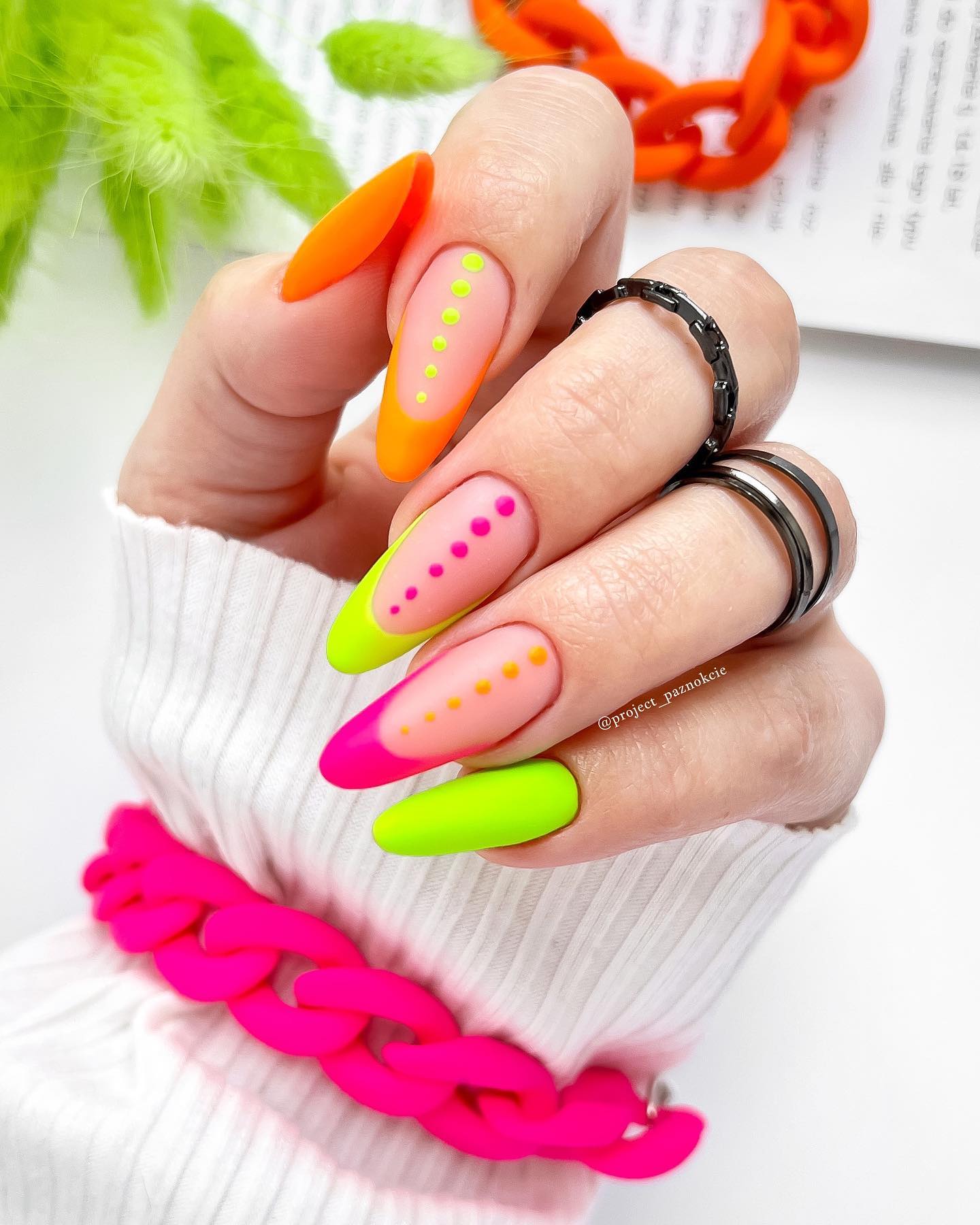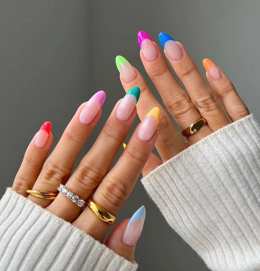 Вариант цветного френча, при котором каждый ноготь окрашивается в отдельный яркий цвет. Самый классный нейл-дизайн для лета уже оценили многие модницы в соц. сетях, так как он отлично сочетается с яркими летними коктейлями, купальниками и общей атмосферой релакса.