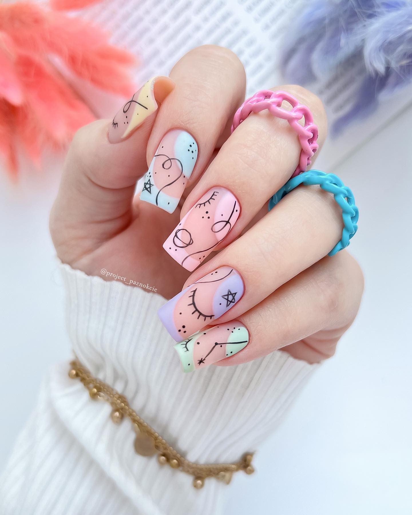 Среди наиболее универсальных идей френча на ногтях 2022 следует отметить маникюр в пастельных тонах. Здесь ногтевая пластина окрашивается в естественные нюдовые тона, а сам ноготь – в лиловый, нежно-розовый, кремовый, мятный, персиковый и другие пастельные. Необычный вариант пастельного френча – ноготь и пластина окрашиваются в пастельные оттенки похожих цветов.