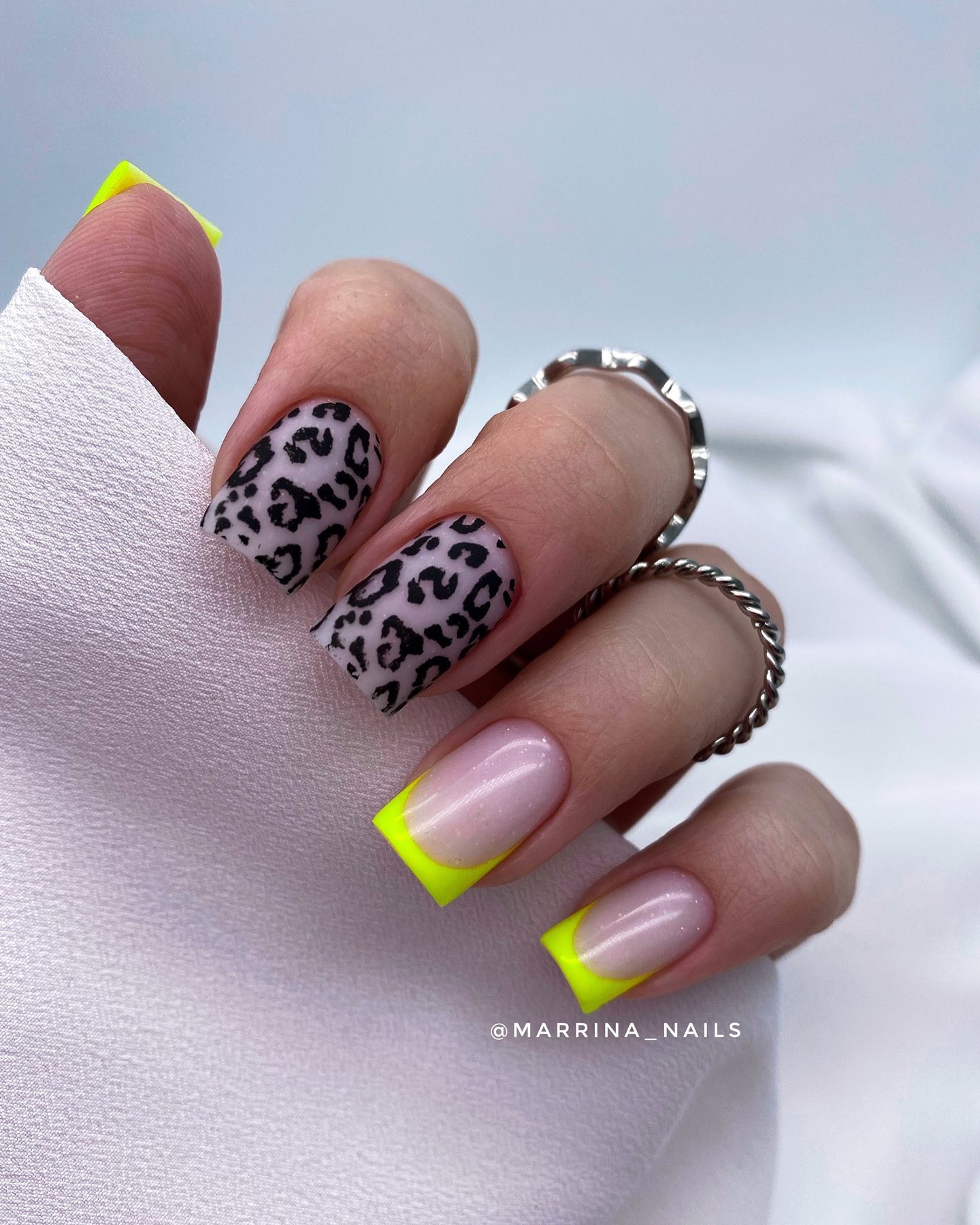 Супергорячий тренд – френч с рисунком, имитирующим животный принт. Зебра, жираф, леопард – выбирайте самостоятельно. Все эти виды френча на ногтях смотрятся сногсшибательно!