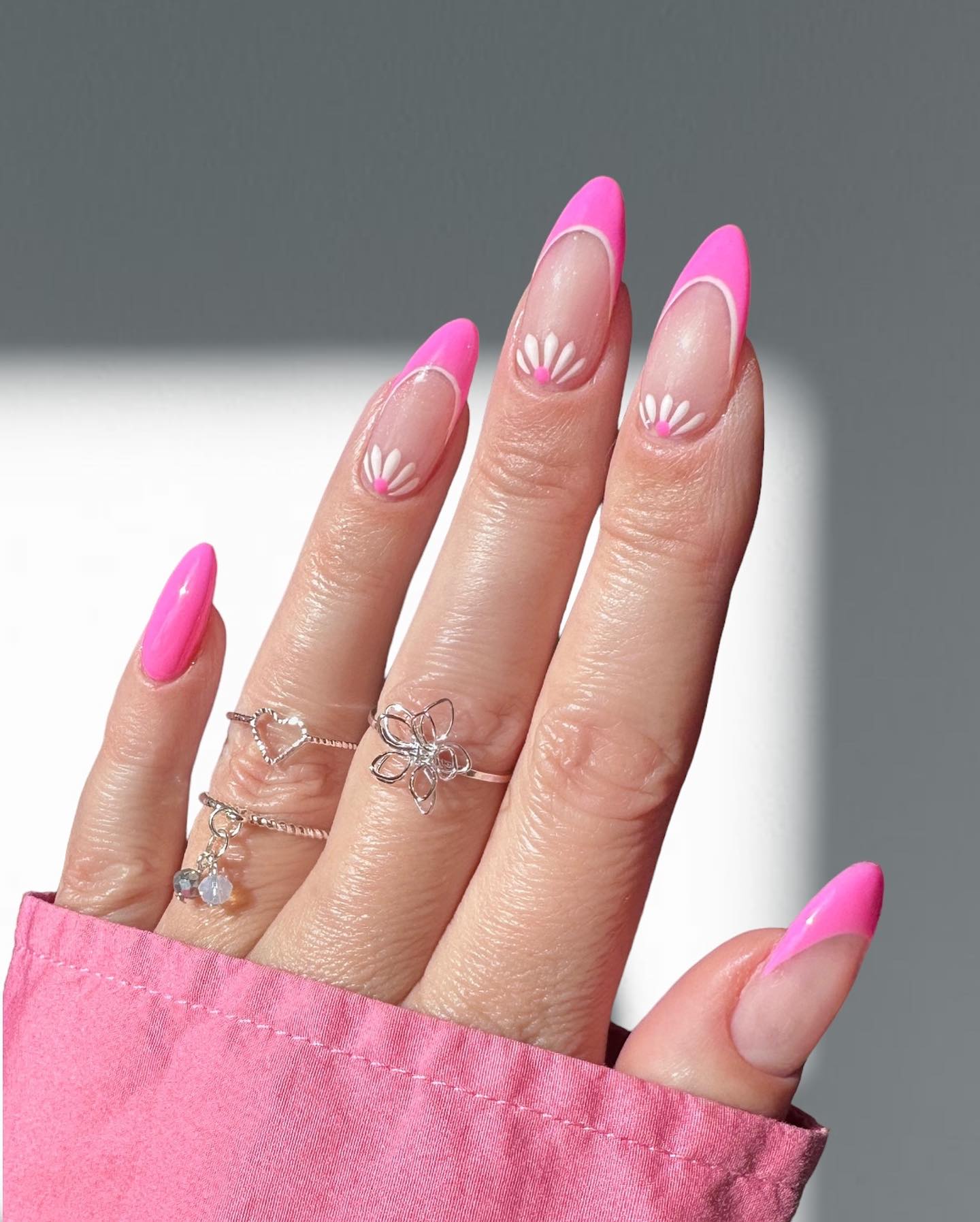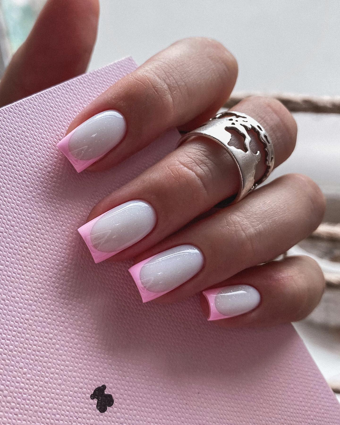 Самый модный оттенок розового лака в 2021-2022 годах – неоновый цвет фуксии. Для французского маникюра использование этого лака не требует никакой смелости: нежно-розовая полоска не будет противоречить даже самому пуританскому наряду. Еще один повод для самовыражения – маникюр омбре, выдержанный в оттенках розового.