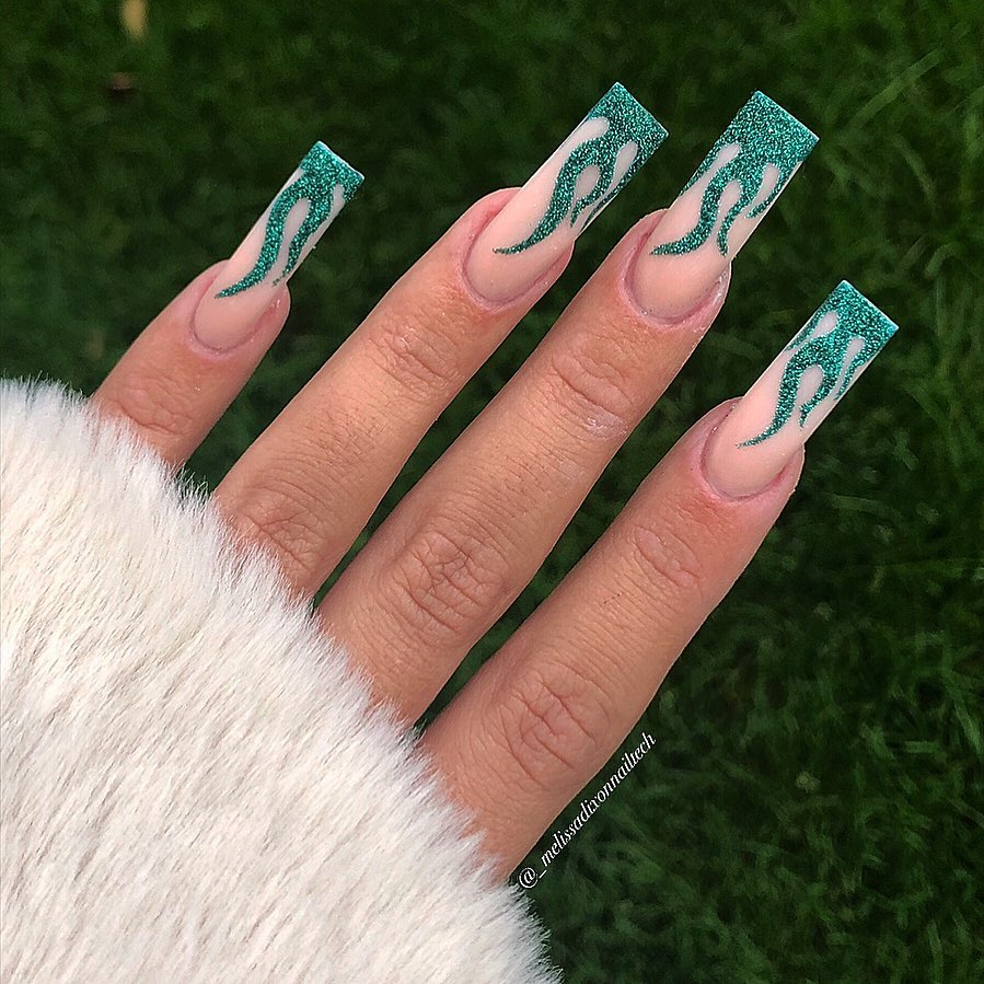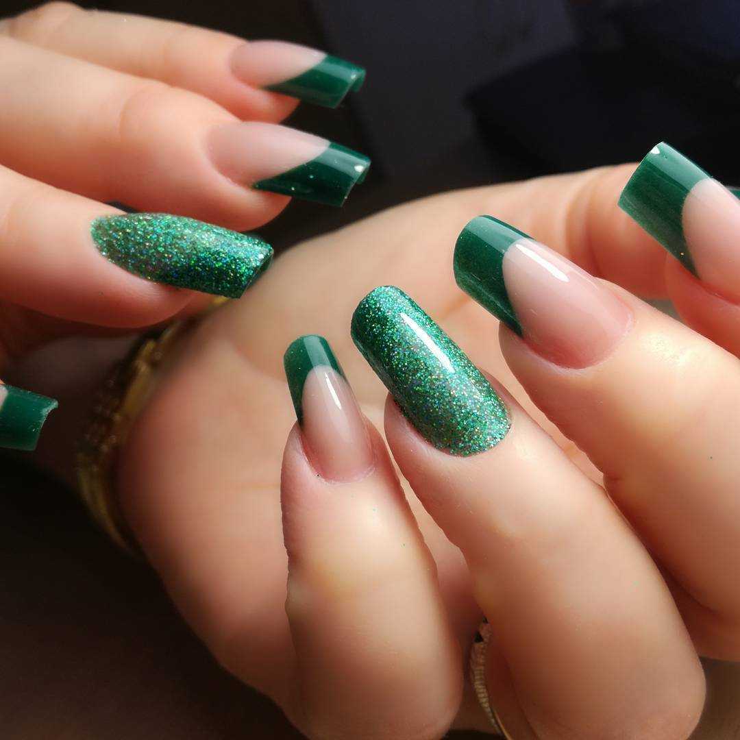 Техника френч ложится на ногтевую пластину квадратной формы. Желательно, чтобы ноготь имел прямоугольную вытянутую форму. Если пластина слегка сужена у кутикулы, визуально выровнять ее поможет лунный френч. Для оформления ногтей квадратной формы подходит геометрические рисунки, блестящий френч, контрастное решение.