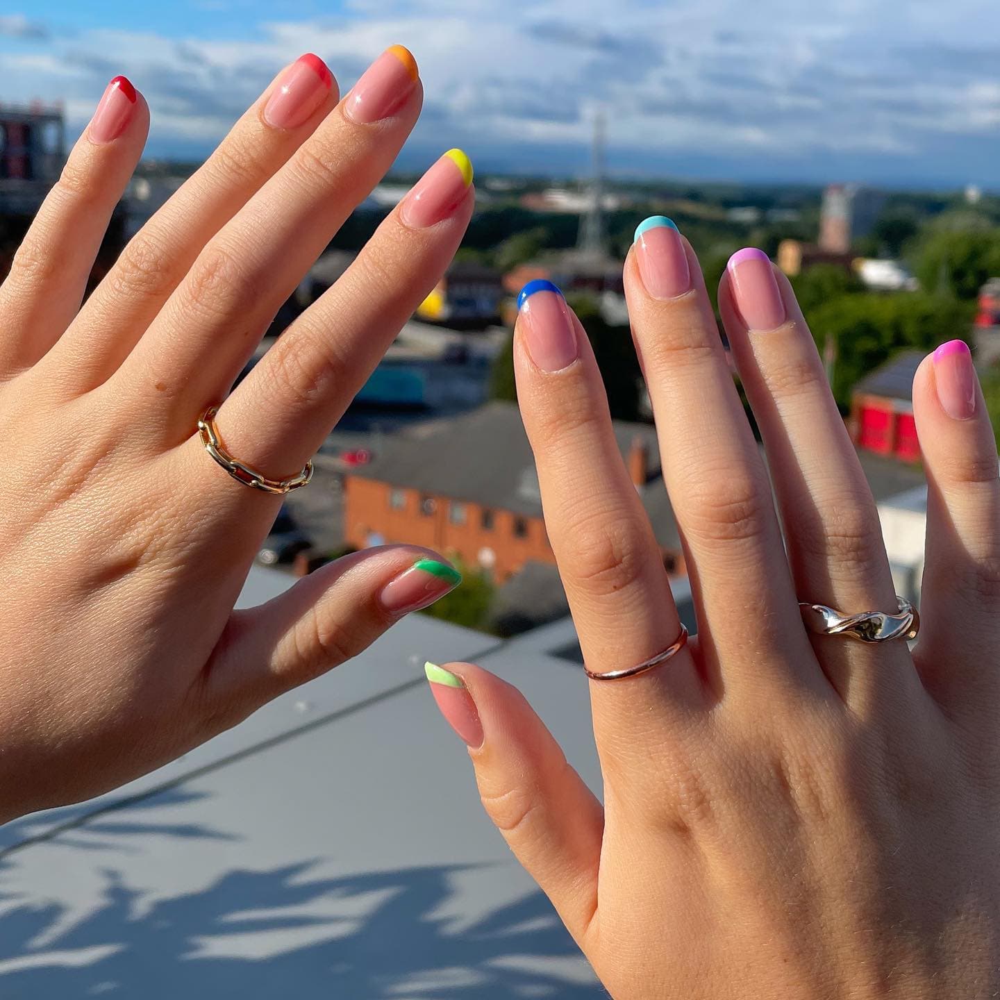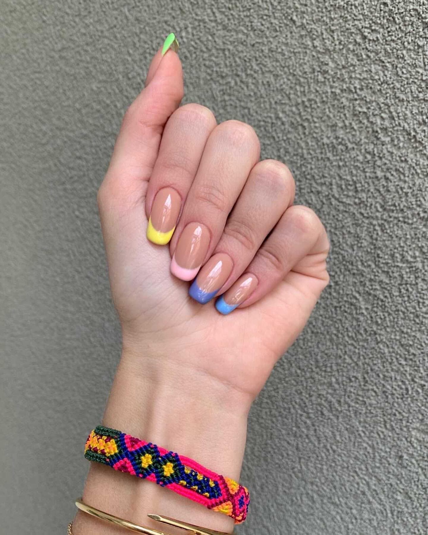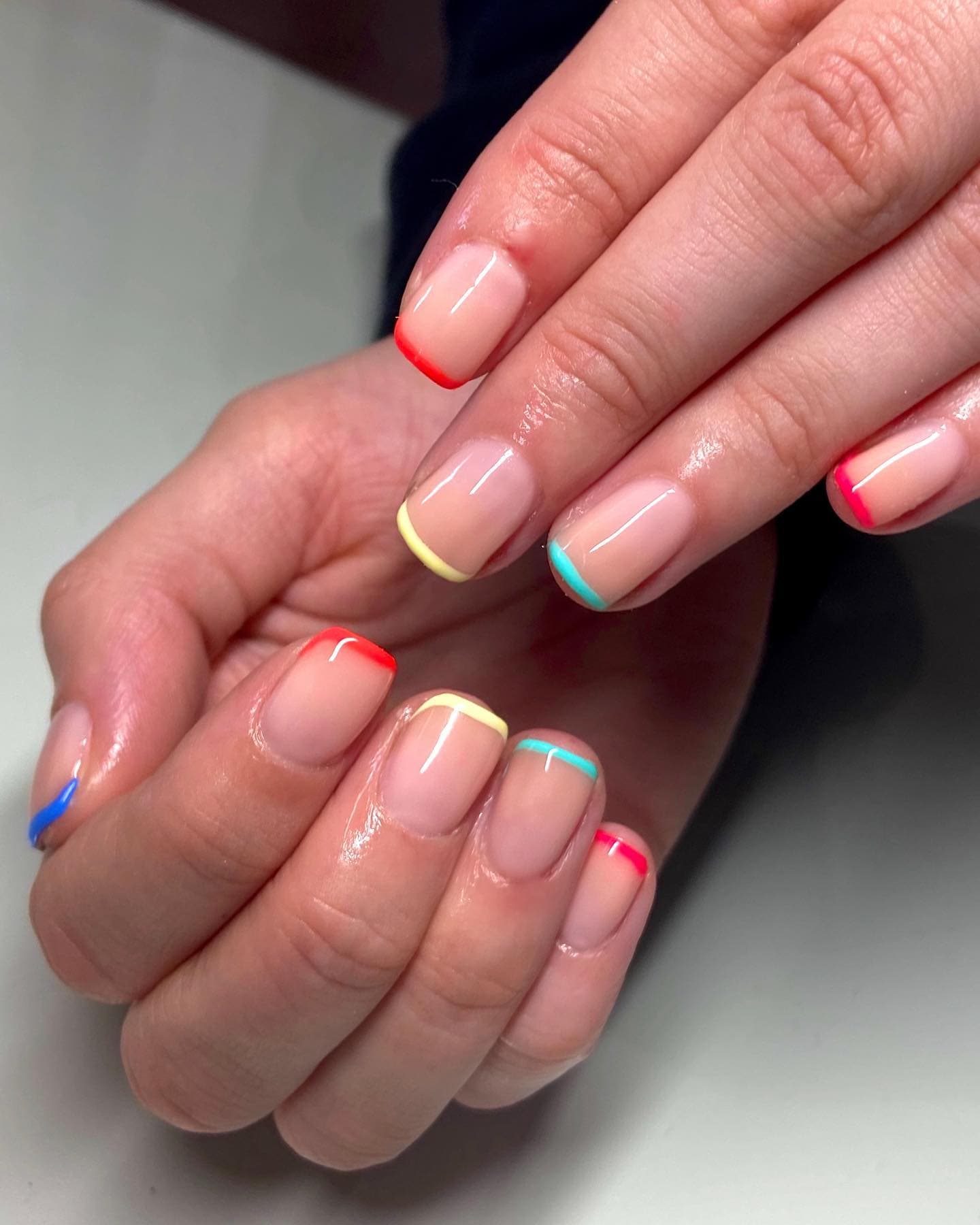 Вариант цветного френча, при котором каждый ноготь окрашивается в отдельный яркий цвет. Самый классный нейл-дизайн для лета уже оценили многие модницы в соц. сетях, так как он отлично сочетается с яркими летними коктейлями, купальниками и общей атмосферой релакса.