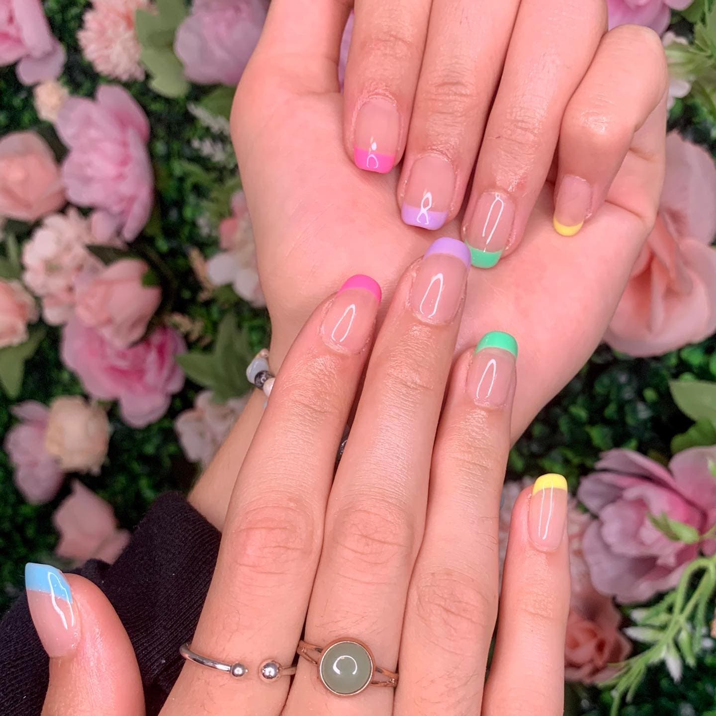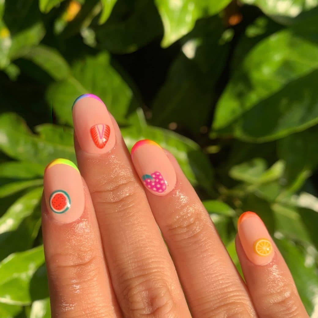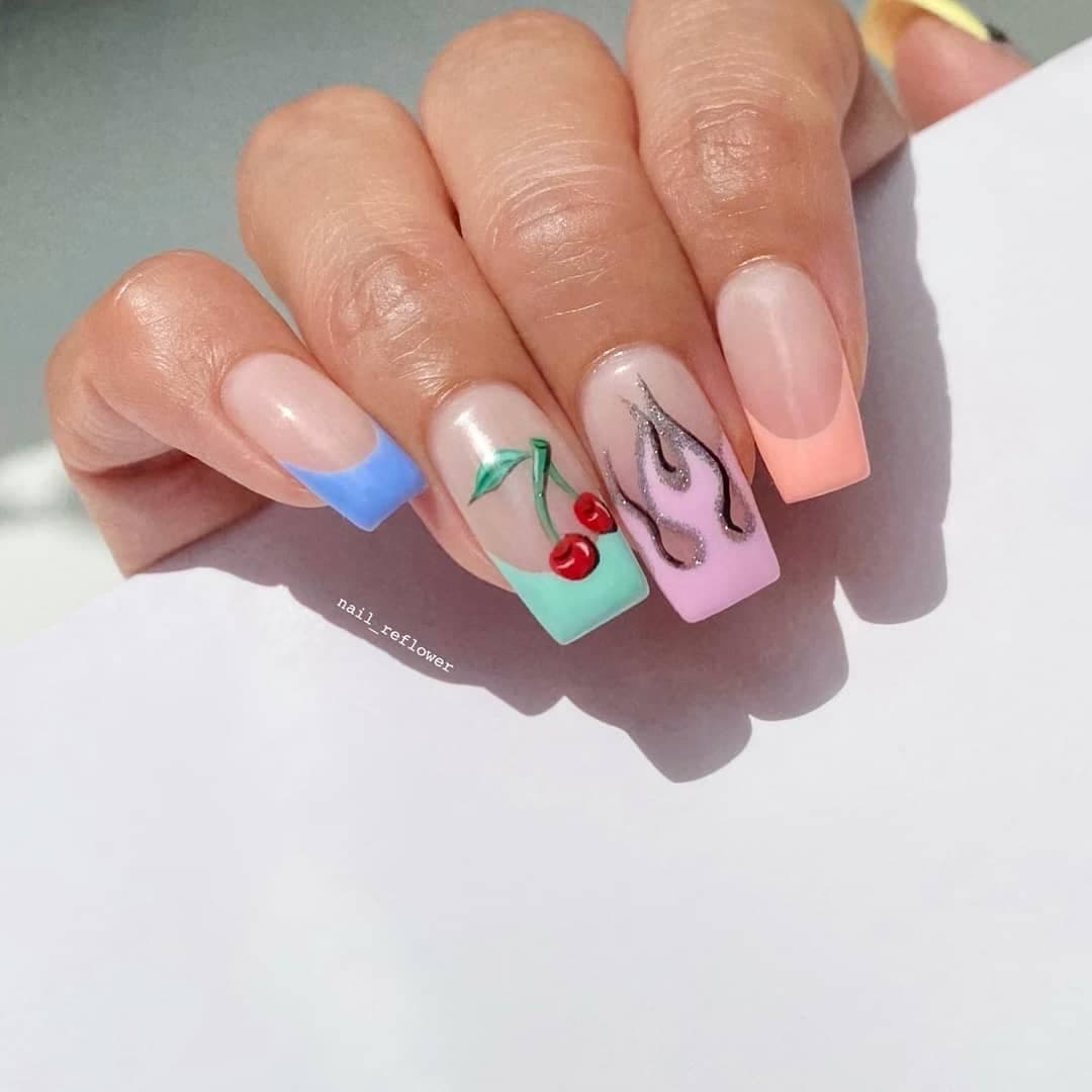 Вариант цветного френча, при котором каждый ноготь окрашивается в отдельный яркий цвет. Самый классный нейл-дизайн для лета уже оценили многие модницы в соц. сетях, так как он отлично сочетается с яркими летними коктейлями, купальниками и общей атмосферой релакса.