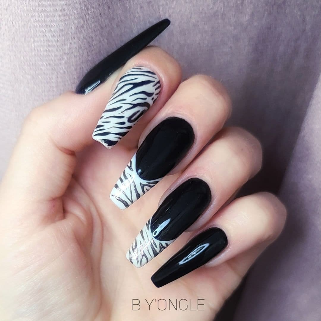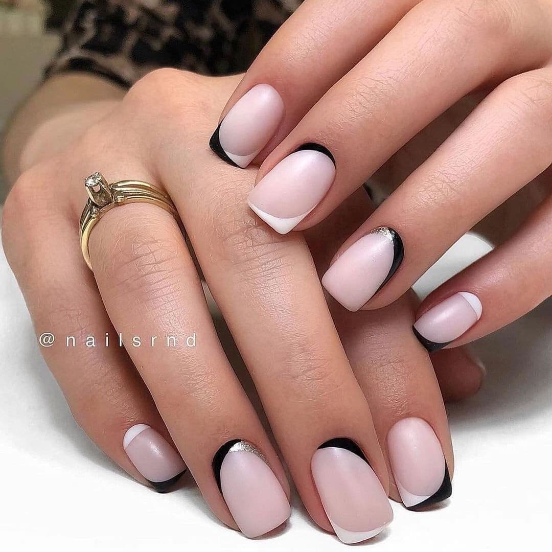 Французский черный включает в себя все те же бесцветные лаки для ногтей, только на этот раз вместо страз узоры нарисованы черным цветом. Узоры могут быть как геометрическими, так и более сложными. Каждый мотив может быть представлен черным цветом, при необходимости можно добавить другой цвет.