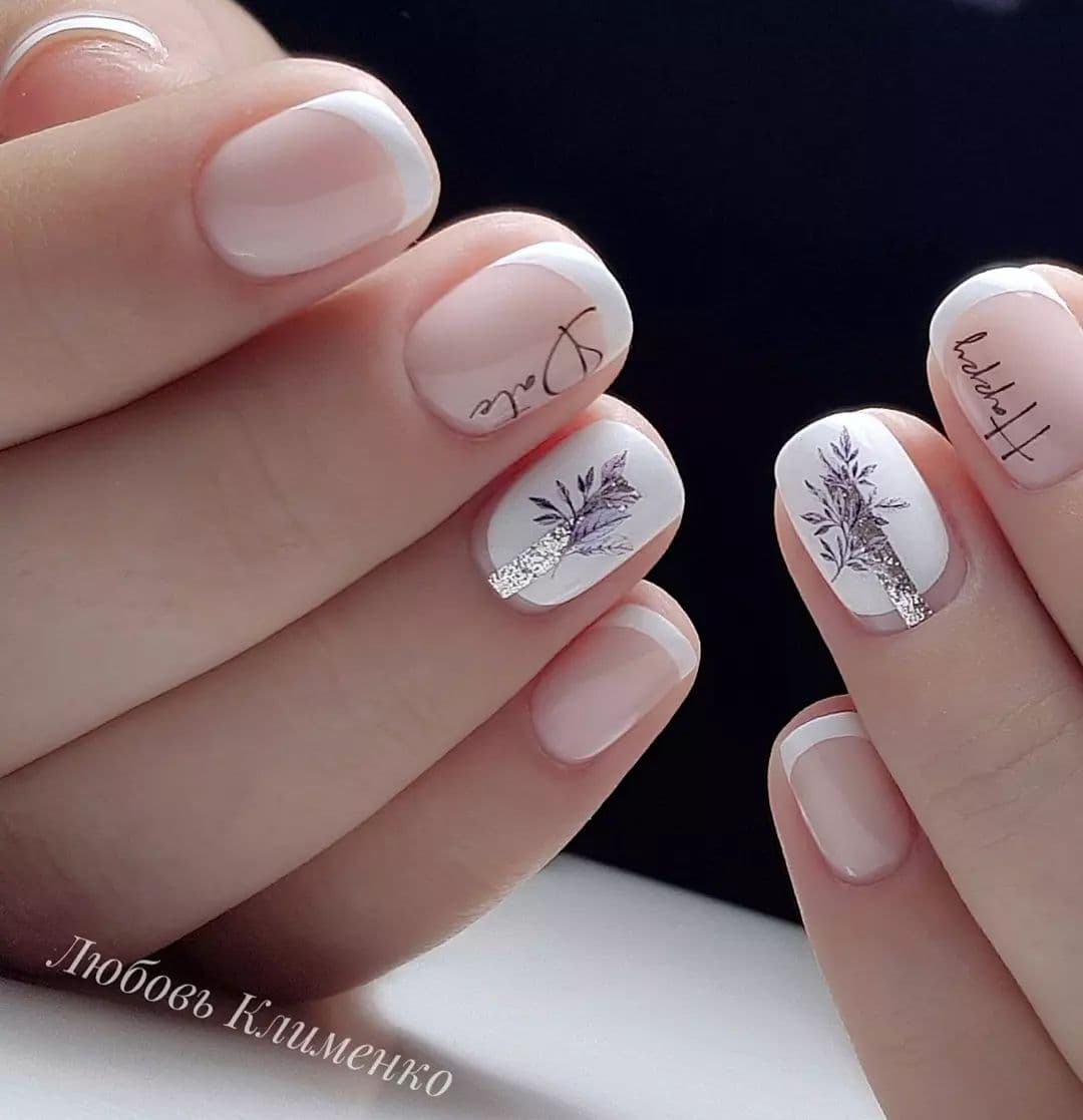 В топе модных тенденций французский маникюр с рисунком. Здесь несколько ногтей дополнительно украшаются рисунком. Выбор принта зависит от вашей фантазии, но все еще популярны растительные, абстрактные и цветочные мотивы.