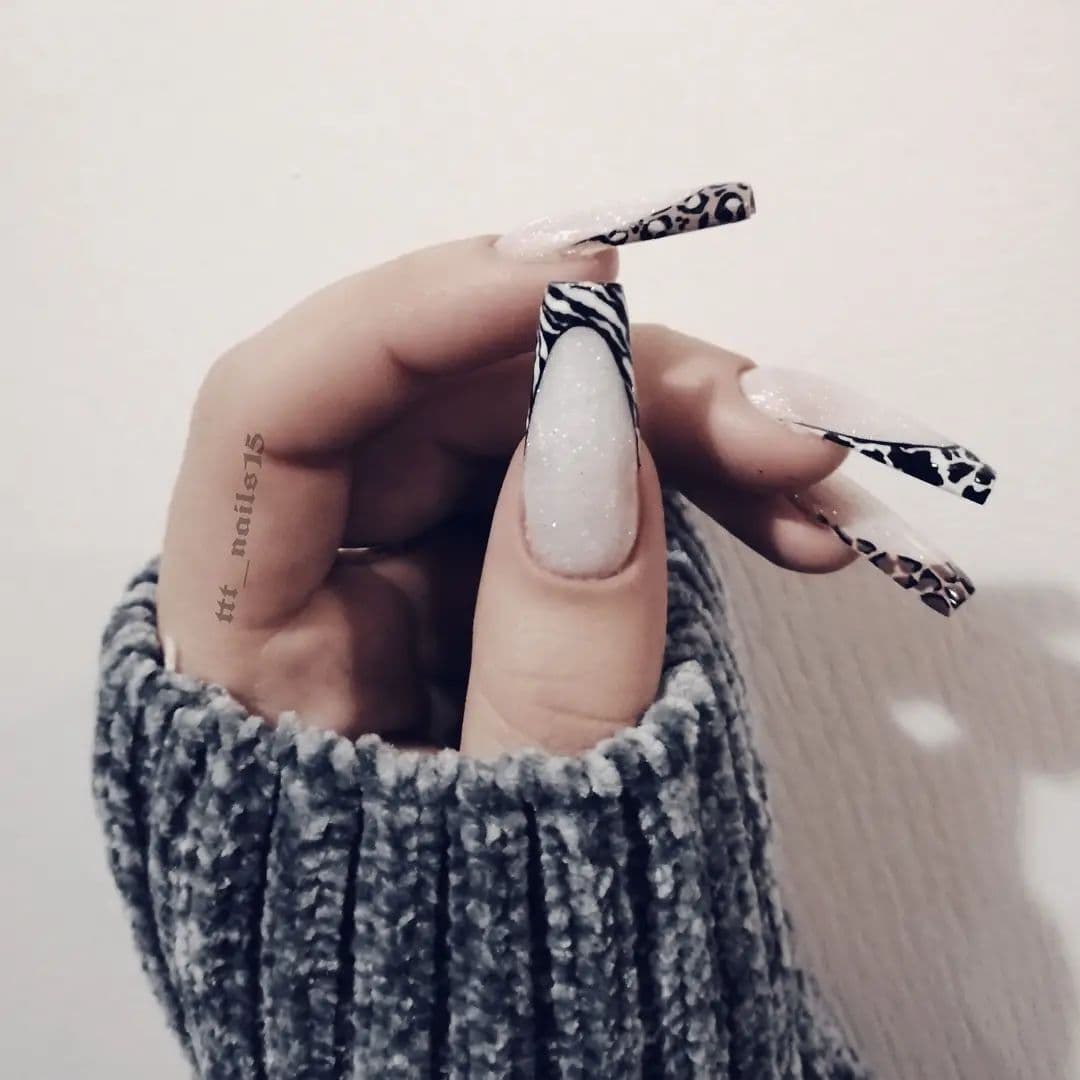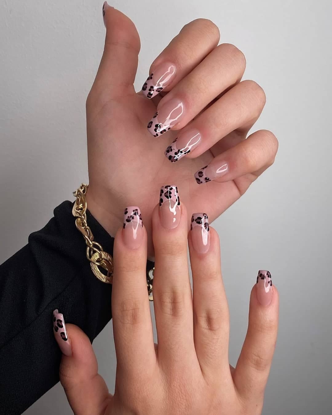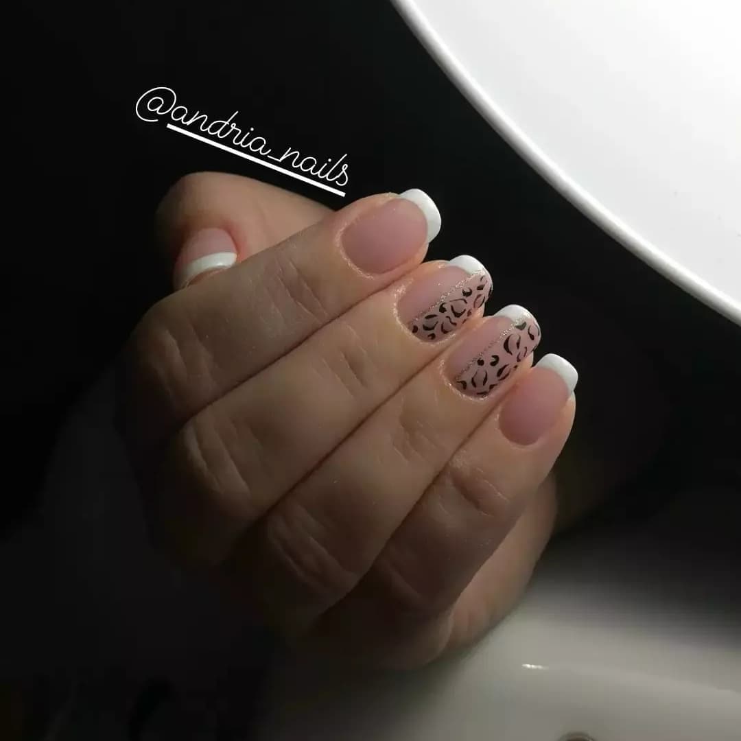 Супергорячий тренд – френч с рисунком, имитирующим животный принт. Зебра, жираф, леопард – выбирайте самостоятельно. Все эти виды френча на ногтях смотрятся сногсшибательно!