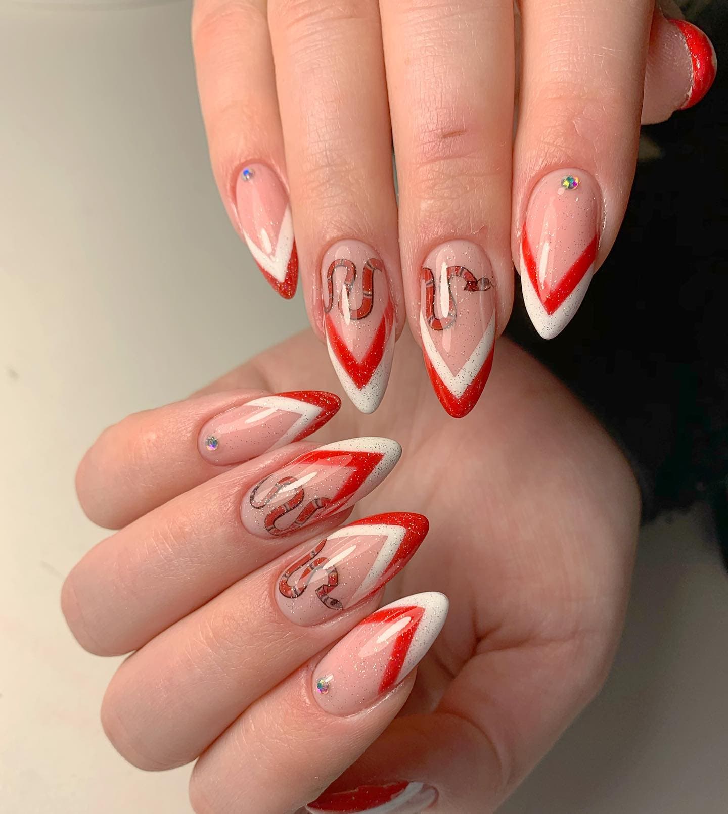 К примеру, сочетание красного и белого оттенка для закрашивания кончиков ноготков.