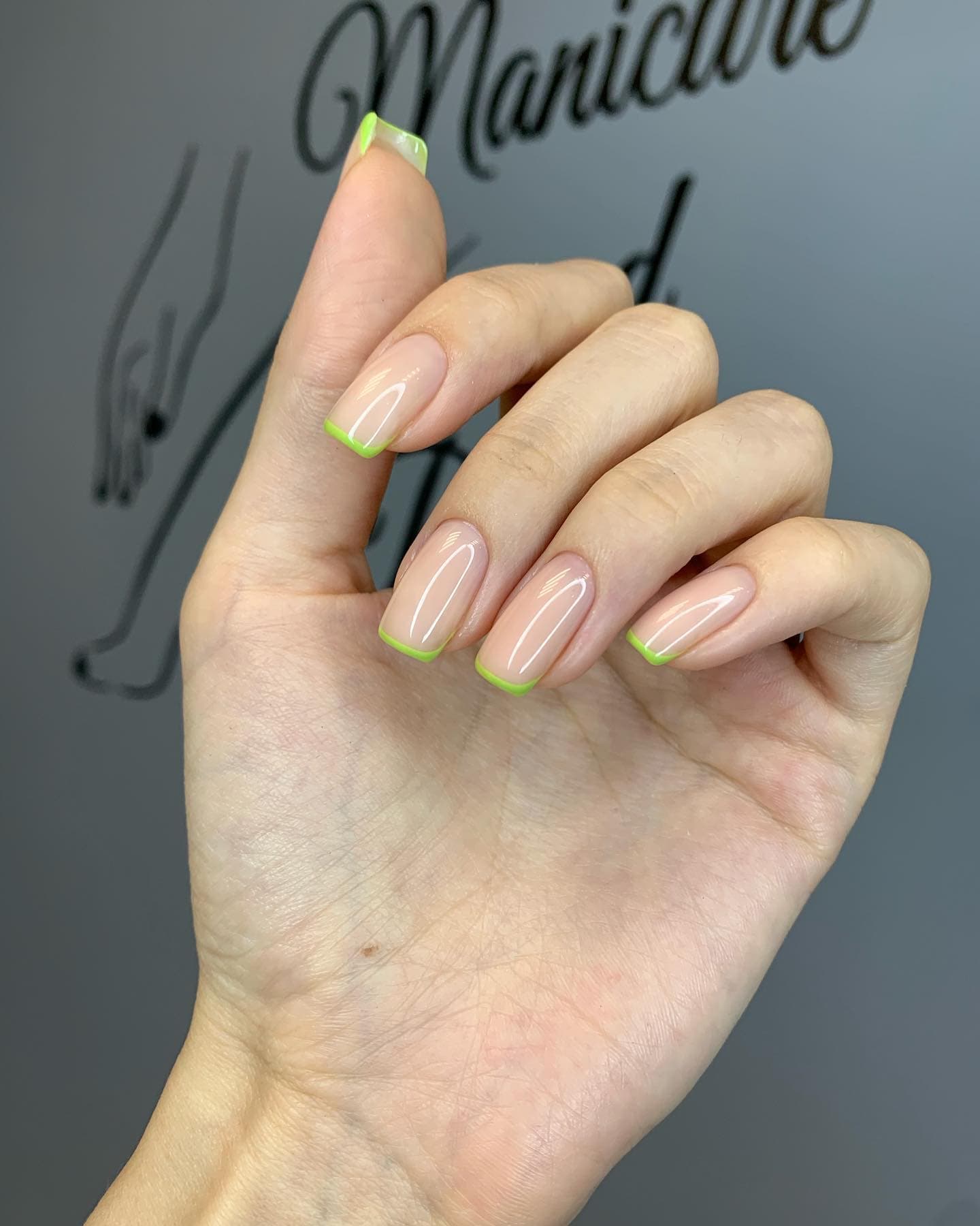 Еще один популярный вариант френча на ногтях, который все чаще мелькает в соц. сетях. Его сделать очень легко – достаточно окрасить край ногтя лаком любимого цвета. Лучше всего это делать с помощью трафаретов для французского маникюра. Самые модные оттенки: зеленый, желтый, оранжевый, ярко-розовый, голубой и сиреневый.