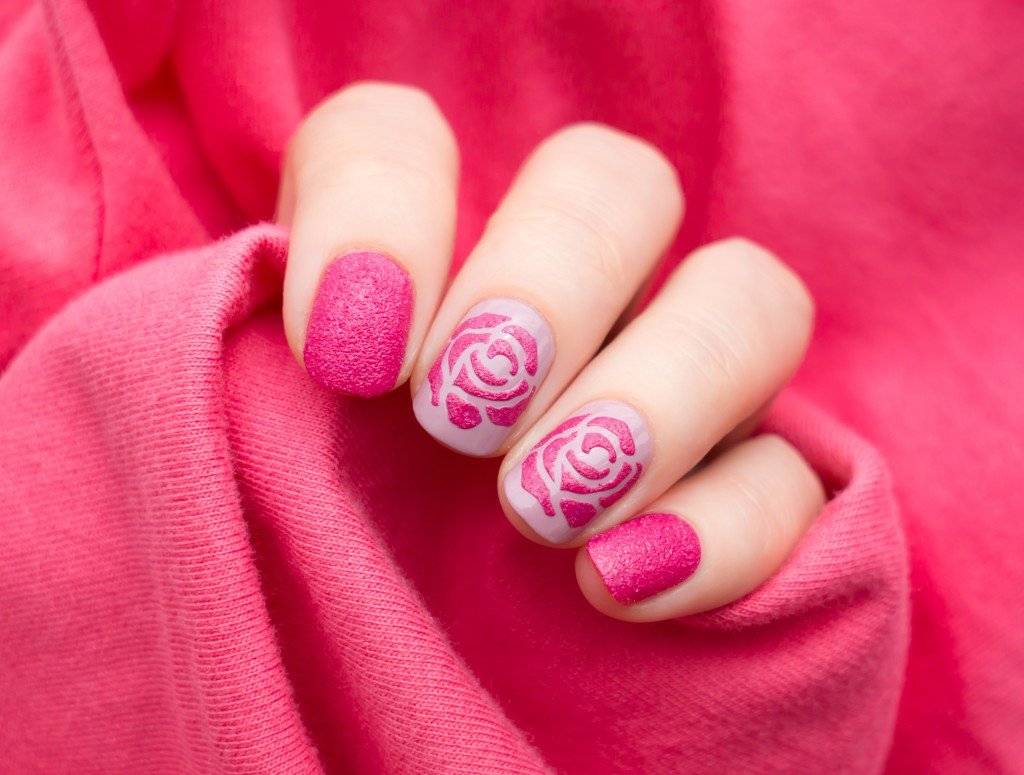 - Чтобы дизайн меньше пачкался, пригодится база для обычного лака. Она жидкая, ложится тонким слоем, быстро сохнет. Наносим ее тонким слоем на узор полусухой кистью, немного втаптывая. Она затечет между крупинками и высохнет невидимой пленкой. Под такой «защитой» розы не потеряют бархатистой текстуры, но не будут пачкаться.