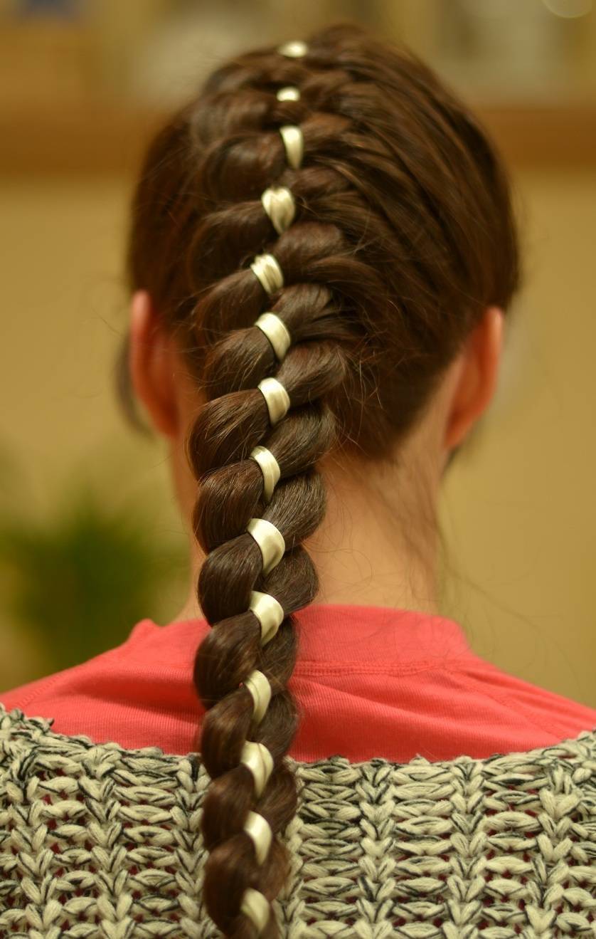 Кончик перевязывается тонкой резинкой, прячется под косу и крепится невидимкой.
