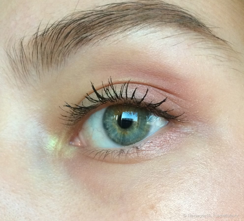 На всем подвижном веке оттенок Muse, складка века и растушевка оформлены оттенками Rebirth, Venus, на нижнем веке оттенки Icon, Muse, Rebirth, во внутреннем уголке глаза и под бровью хайлайтер Becca “Vanilla Quartz”.