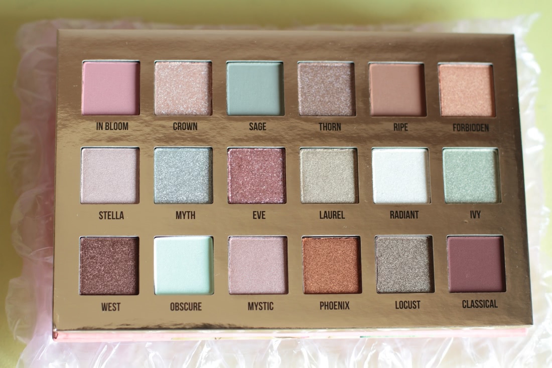 So let’s talk about this palette than and what it features. In an 18 pan palette you get 4 mattes and 14 shimmers. The shimmers range in intensity and density while the mattes are all smooth and buttery. What also stands out is the fact that this is a predominantly cool to neutral palette. You essentially only get 3 real warm tones: Ripe, Forbidden and Phoenix. Everything else consists of cool toned greens, rosy pinks and some borderline coppers and golds that pull in different directions depending on what you pair them with. For instance, West looks like a copper in the pan but has a pink undertone that makes it go well with the rosy tones in the palette. The palette isn’t very deep: the deepest shade here is Classical, but as you will see below that is not the perfect shade for deepening up all the looks.