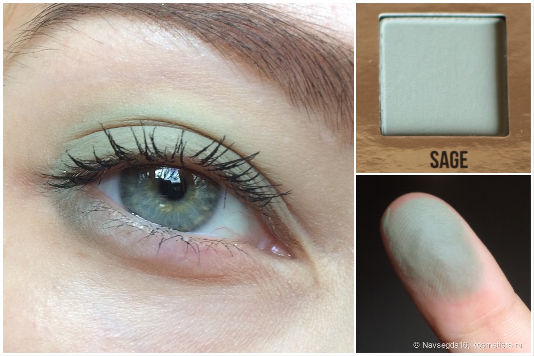 3. Третий матовый Sage. Данный оттенок не совсем понятен- в палетке он выглядит как серый, на свотче скорее зеленоватый. Так же и на веке.