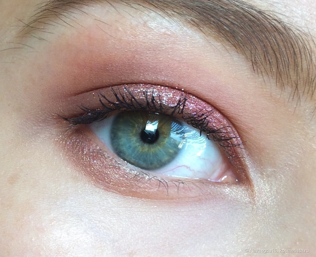 На подвижном веке использованы оттенки Shell, Venus, Icon, растушевка оттенком Divine, на нижнем веке оттенки Icon и Muse, во внутреннем уголке глаза и под бровью оттенок Aura.