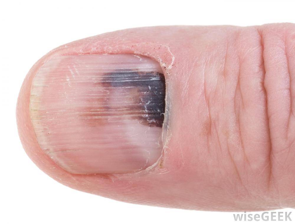 При травме ногтя на месте разрыва кровеносных сосудов возникают кровоизлияния в ногтевом ложе. Под ногтевой пластинкой в этом случае просвечивает пятно темно-багрового, синего, а иногда и черного цвета, которое по мере роста ногтя сдвигается вперед до исчезновения. Такое явление часто возникает после ушибов. При обширном излиянии ноготь может отпасть, не рекомендуется покрывать гель-лаком.