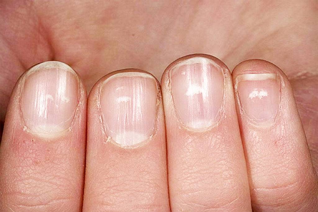 На ногтевой пластине могут появляться горизонтальные или вертикальные бороздки и полосы