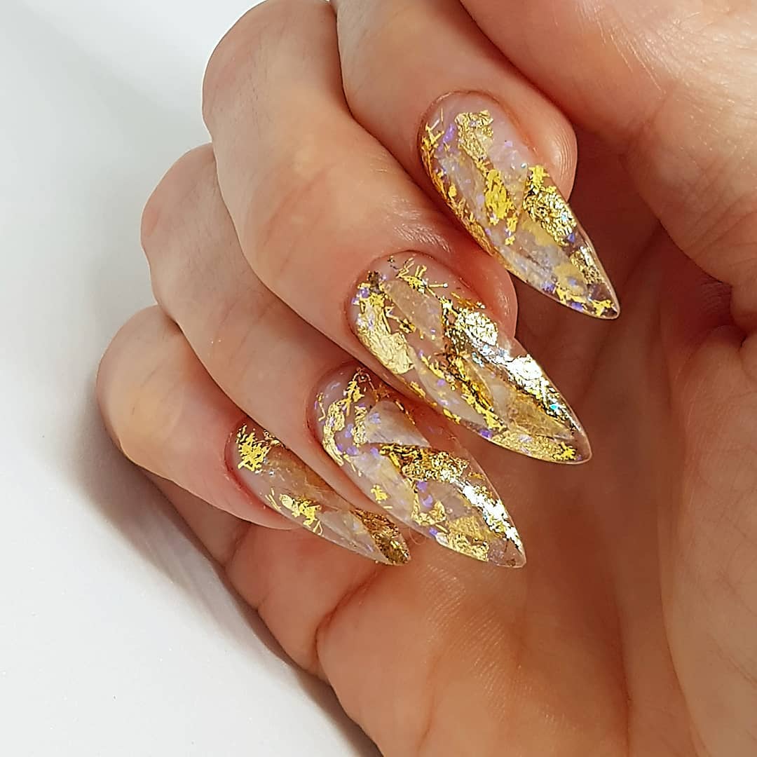 Голографические ногти получаются, когда во время наращивания ногти покрываются специальным блестящим переливающимся составом. Это может быть и пыльца, которая накладывается на ноготь перед нанесением геля или акрила.