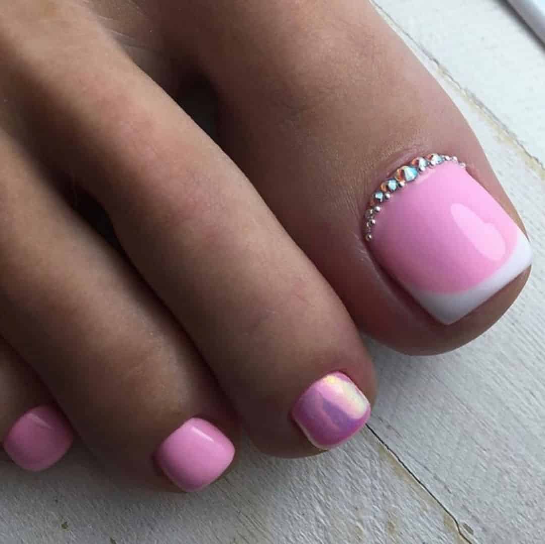 Сочетание бразильского педикюра и нежно-розового покрытия — одно из лучших решений для летнего сезона и поездки на отдых. Для декорирования используют стразы разной величины, блестки и геометрические принты.