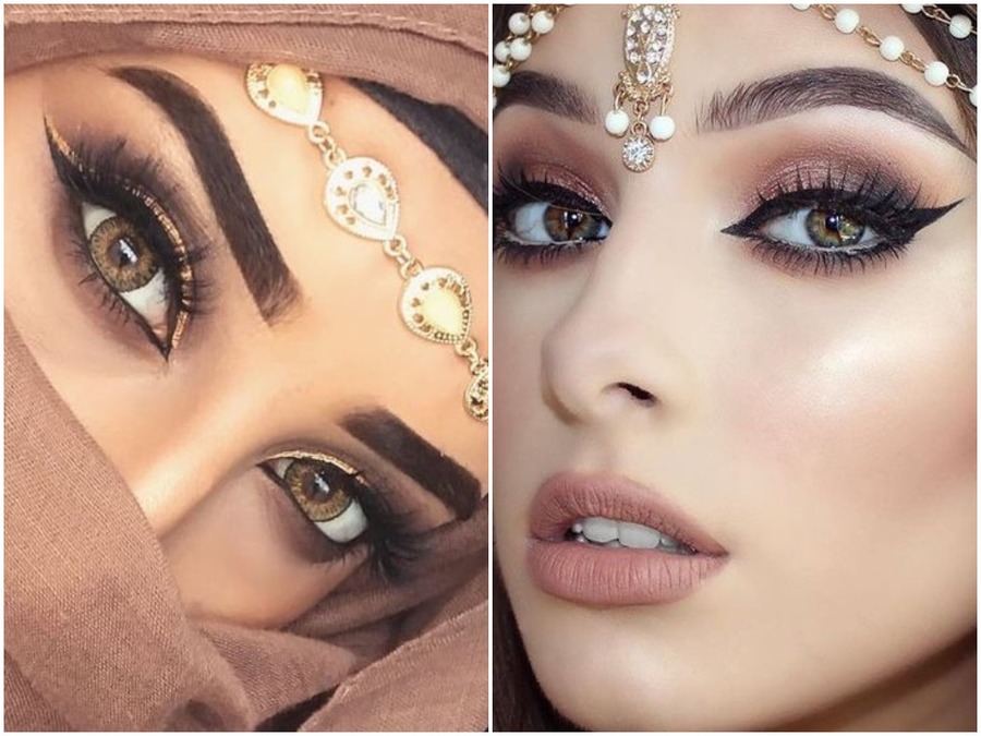 Арабский макияж глаз сочетает в себе интенсивные, сочные оттенки теней, стрелки, объемные и длинные ресницы, а также яркую помаду. Этот макияж позволит вам разгуляться. Вы можете доставать из своего арсенала стразы, блестки и камни. Все пойдет в ход.