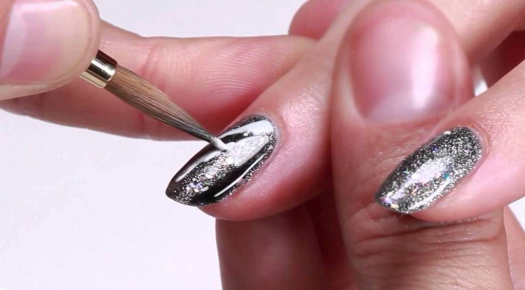 Важно, чтобы поверх гель-лака наносилось топовое покрытие без липкого слоя. В противном случае при втирании пудры не получится блестящего эффекта