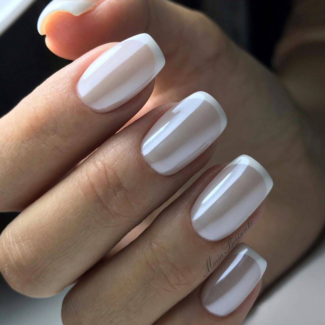 На белый шеллак мастера нейл-арта обычно наносят именно жемчужную втирку, чтобы добиться легкости и нежности на руках.