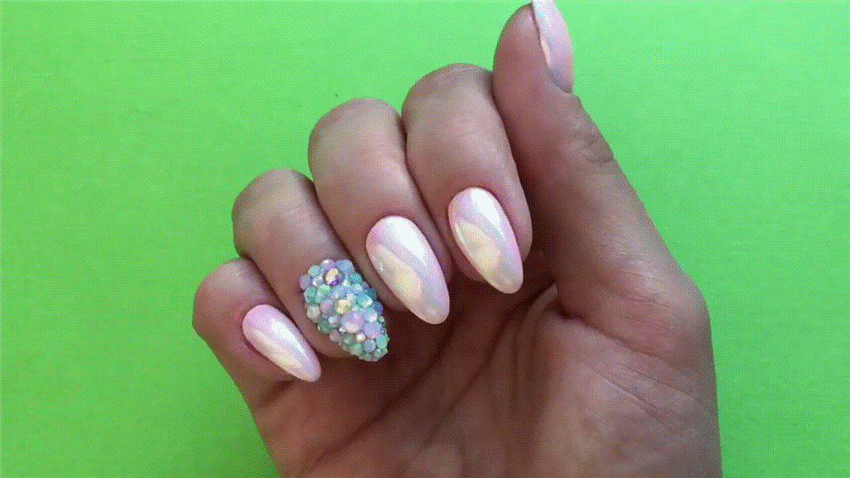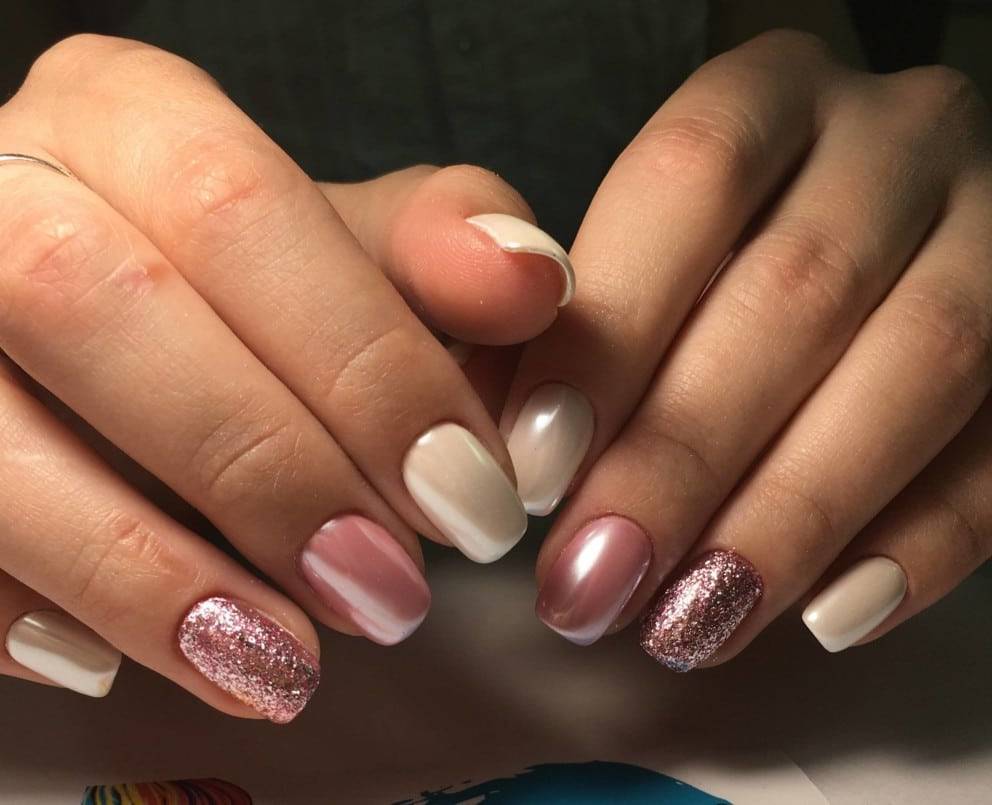 Если вы в домашних условиях пробуете сделать жемчужный маникюр, то следует отдать предпочтение более простым вариантам, то есть лаку или втирке, сочетая разные цвета.
