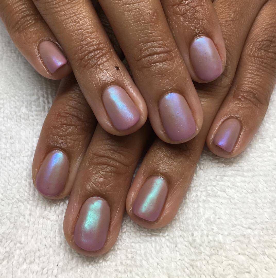 В данном случае попробуйте использовать именно дисперсионный порошок. Он создаст более стильный отлив даже на ноготках, оформленных в темном цвете.