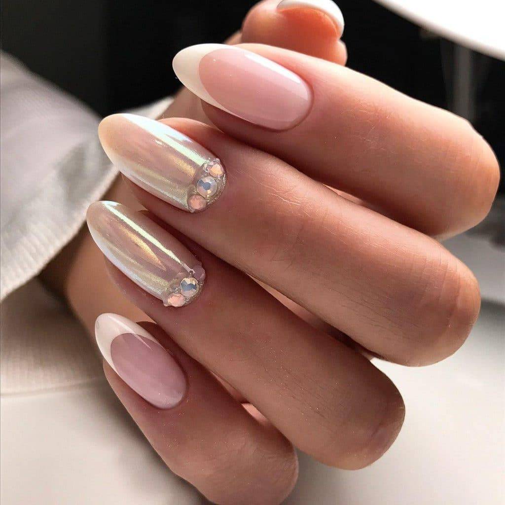 Французский маникюр и его брат-близнец лунный маникюр можно красиво дополнить жемчужной втиркой. При том может быть задействована как кончик ногтя, так и пластина целиком.