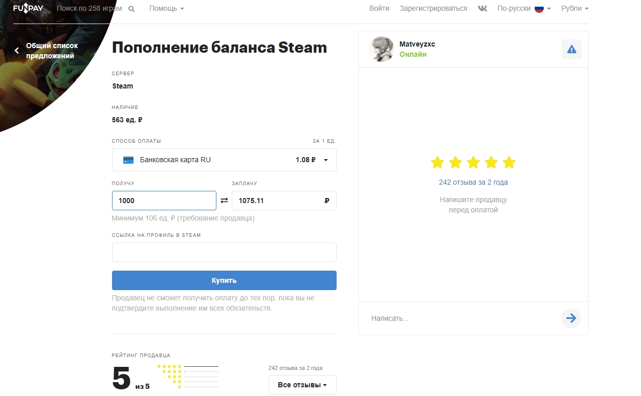 В том случае, если по каким-то причинам перечисленные выше способы пополнения кошелька Стим вам не подходят, обратитесь к людям, которые за определенное вознаграждение пополнят ваш баланс Steam. Найти их можно на специализированных сайтах, к примеру, тут: