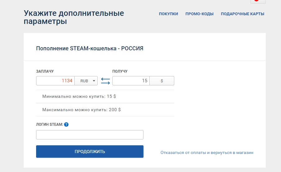 - Заполните форму, указав свой логин (не ник) Стима и сумму пополнения кошелька.