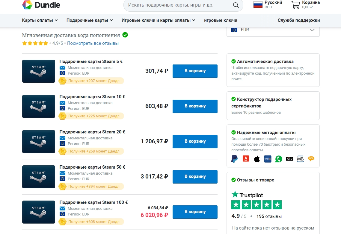 Сегодня приобрести карты в РФ можно только в онлайн-магазинах. Стоимость карты зависит от ее номинала и включает дополнительную сумму за услуги продавца. Мы рекомендуем покупать подарочные карты Steam на проверенных сайтах: