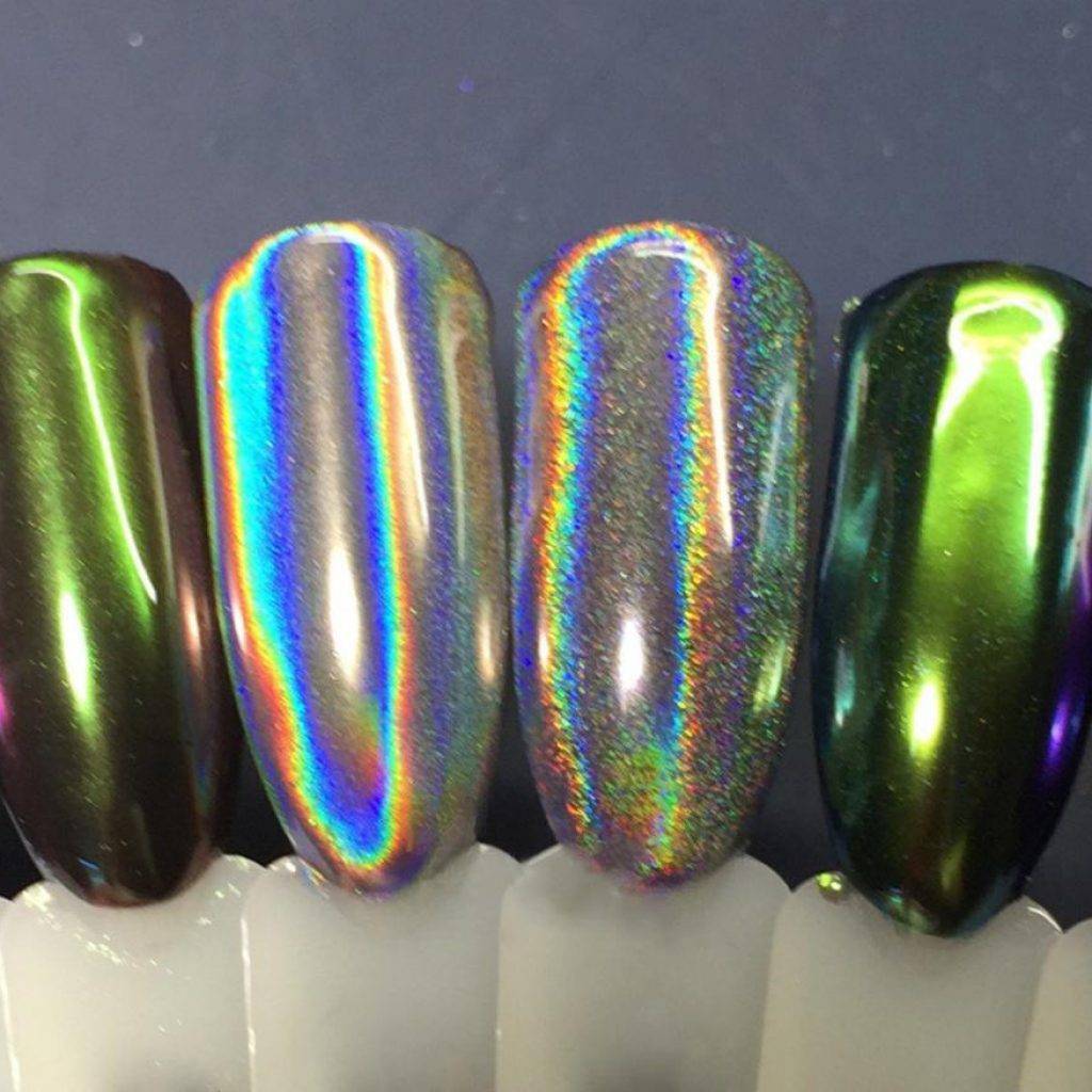 При голографическом покрытии поверхность радужно переливается с легко различимыми мерцающими фрагментами. А вот маникюр призматик обеспечивает однородность разводов с минимально видимыми блёстками. Для получения оттенка хамелеон применяется пудра с переливающимися зелёными и золотистыми тонами. Маникюр с хромированным эффектом северного сияния можно выполнить, если использовать дуохромную пудру, переливающуюся сине-фиолетовыми тонами.