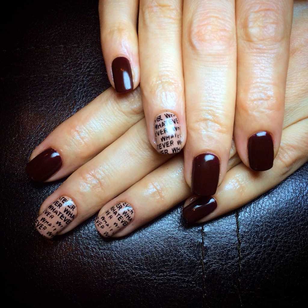 Второй, более бюджетный вариант – использовать простую газету. С ее помощью можно сделать оттиск с текстом или же нанести на ноготок небольшой отрезок. Такой маникюр сможет сделать даже новичок, но перед нанесением рекомендуем немного потренироваться.