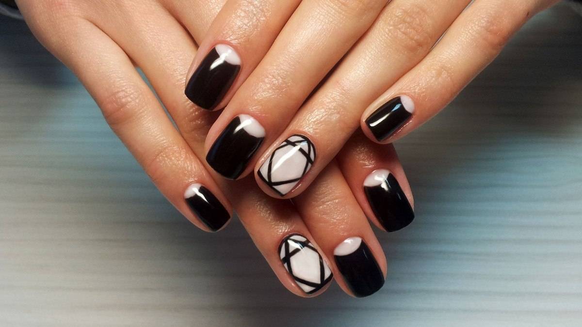 • френч с геометрическим дополнением – непривычным и очень нежным вариантом французского маникюра выступает дизайн в виде прокрашенных параллельных трёх линий в зоне улыбки на короткие ногти и отступающими от неё линиями в виде треугольников ближе к прикорневой зоне. Получается нечто вроде ёлки, упирающейся в полосатую плоскую вершину. Аккуратность и лёгкость такого нейл-арта заключается в том, что основой служит прозрачный гель, а линии прокрашиваются исключительно белым цветом – эффект поразительный;• треугольный лунный – элегантное и нестандартное решение, при всём при этом очень простое. Основой такого маникюра зачастую выступает румяно-розовый светлый фон, а вместо линий лунулы в прикорневой зоне очерчиваются чёрного цвета равнобедренные треугольники, полностью закрашенные угольным цветом. Острота линий в своём минимализме смотрится скромно, но довольно оригинально. Дополнить картину может декорация со стразами, поточечно вставленными дотсом в вершину каждого треугольника;• ромбовидный градиент – необычное омбре, которое предстаёт в виде пересекающихся слоёв полупрозрачного геля в диагонально прокрашенных направлениях. Каждый новый слой частично ложится на старый, образуя в пересечении движущихся диагоналей светлые и тёмные ромбики. Чем выше движется от зоны лунулы прокрашенная диагональ, тем больше наносится на нее слоев, тем темнее и насыщеннее становится к области среза ногтя цвет геля, формируя, таким образом, ромбовидный градиент.