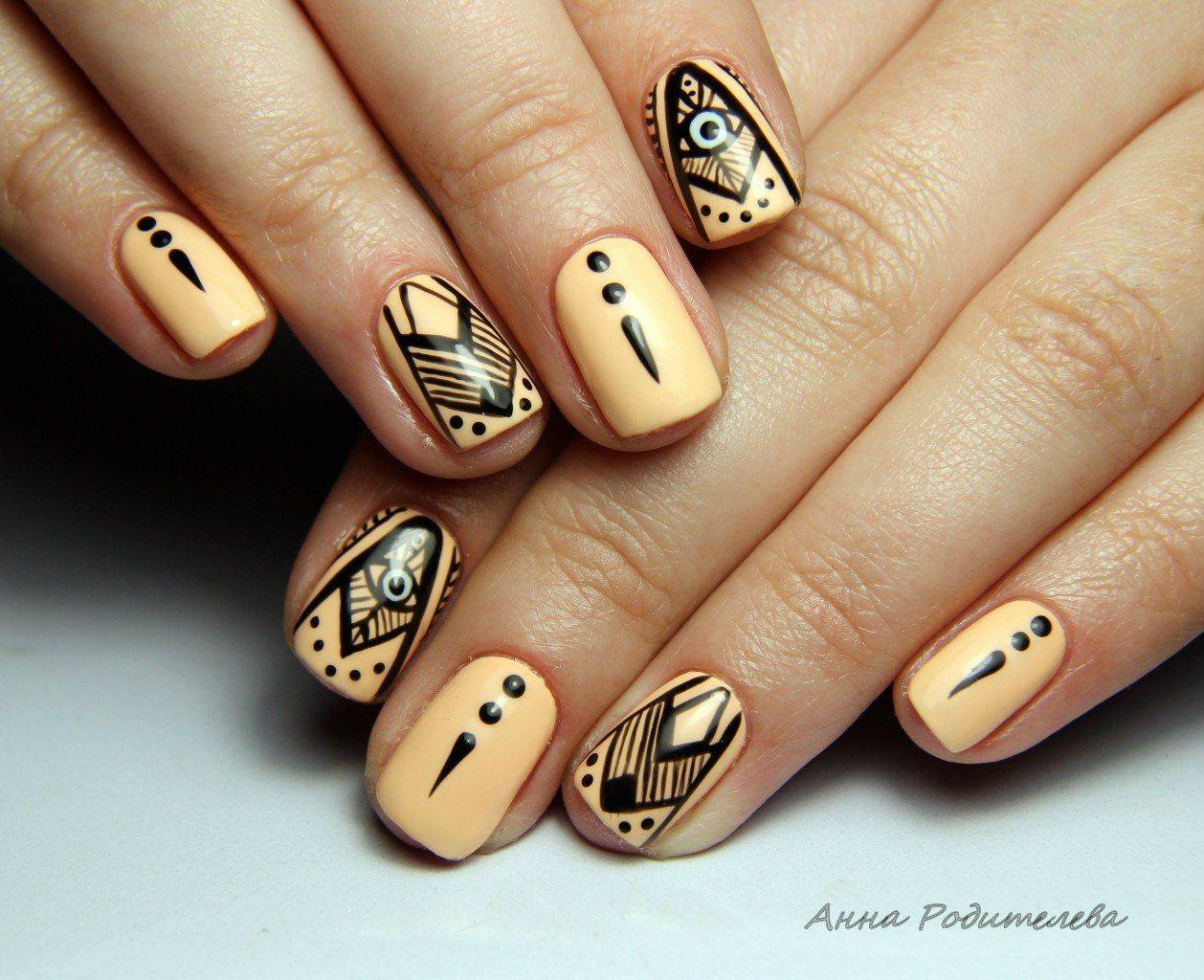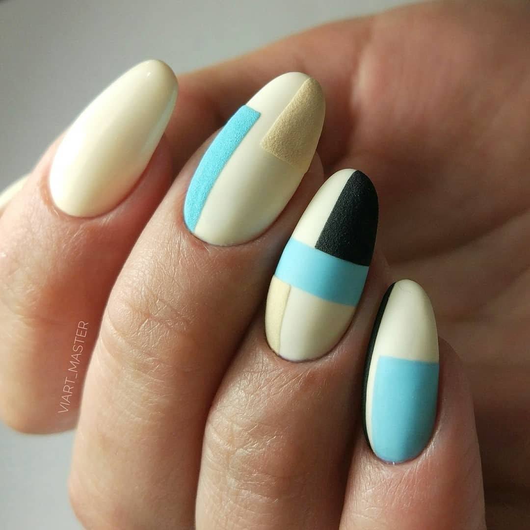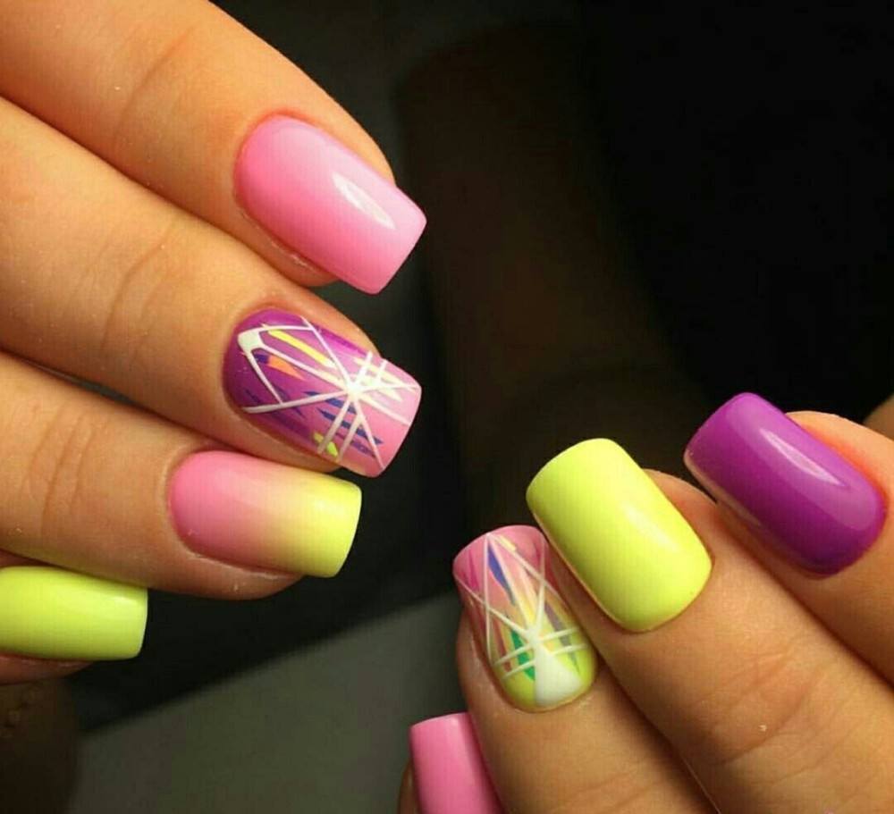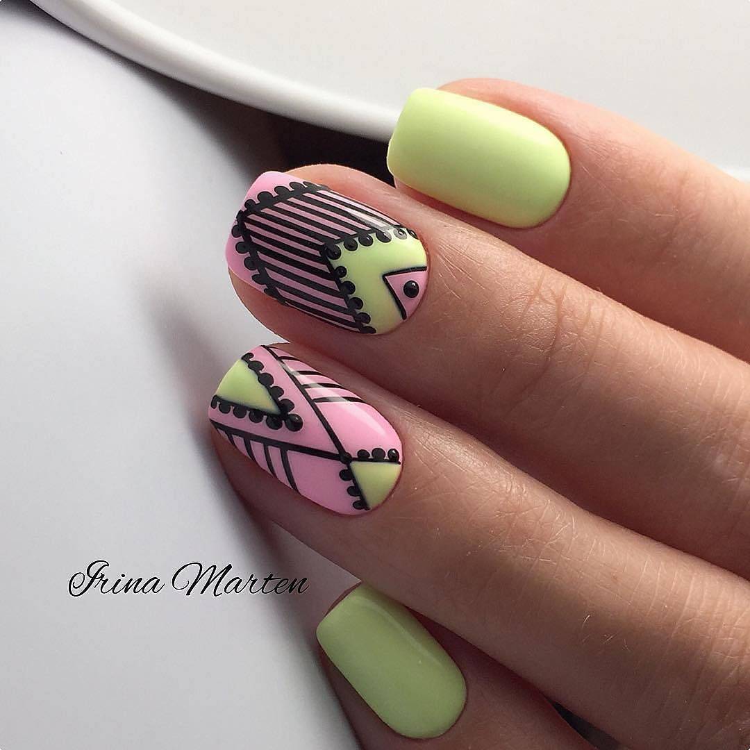 Цветной маникюр с геометрией – это хороший вариант летнего маникюра. Здесь могут быть яркие и сочные цвета лака, разнообразная геометрия, миксуются матовые и глянцевые покрытия, добавляется шиммер, фольга и песок. В большинстве случаев геометрия делается не на всех пальцах, а на одном и двух пальцах руки. Часто в качестве узора выступают сложные этнические орнаменты, сплетение геометрических фигур.