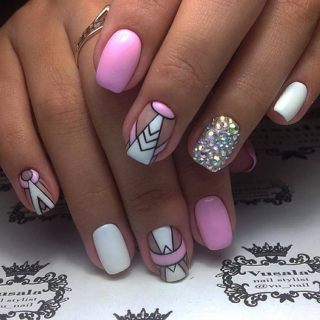Не менее привлекательно будут выглядеть попытки повторить фото-новинки, выполненные на розовом фоне с добавлением белых линий, пересечения которых образуют геометрические фигуры – треугольники, ромбы, квадраты. Это одновременно строгий и нежный вариант, который многим придется по душе.